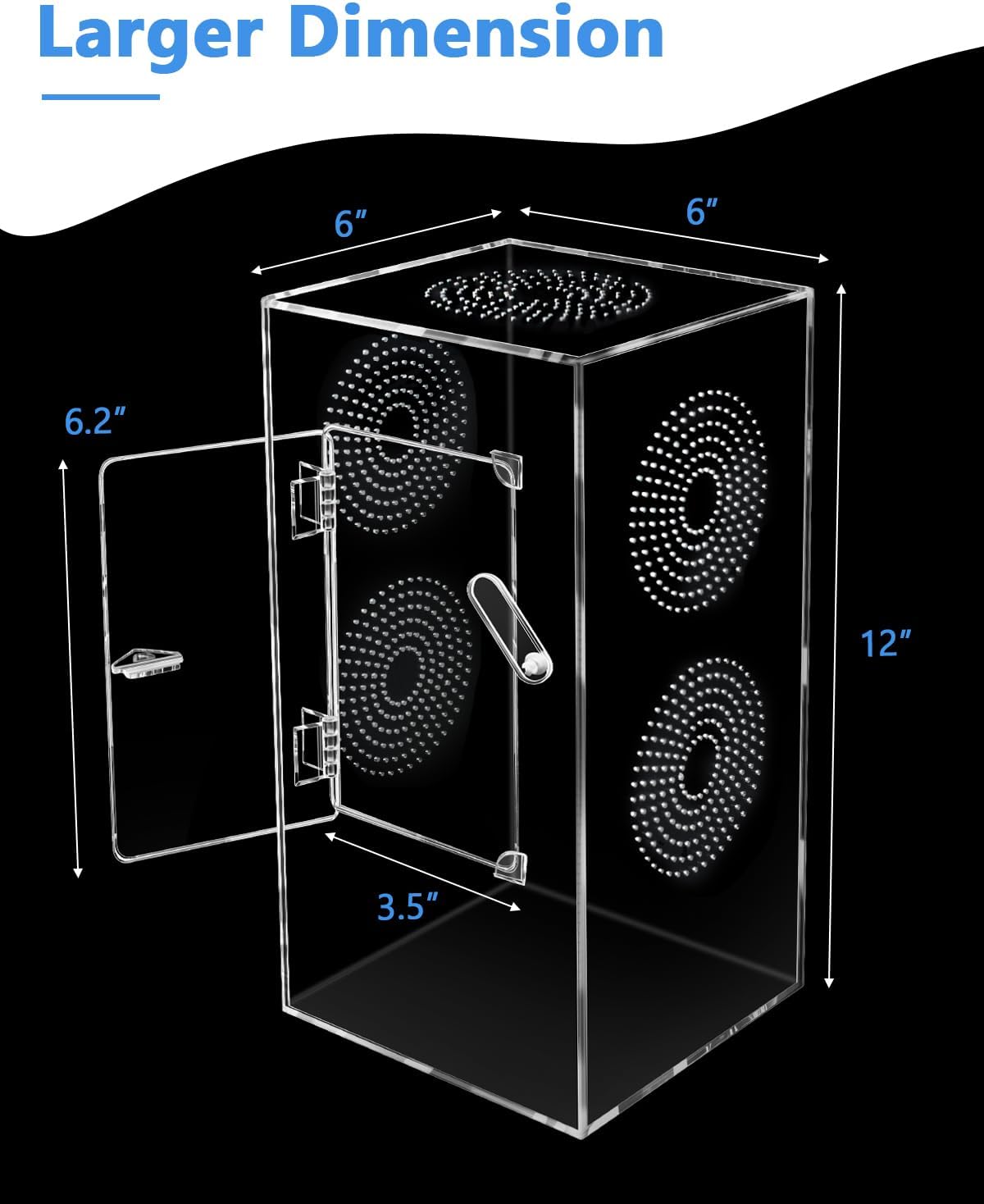 Escape-Proof Design: Our jumping spider enclosure feature an escape-proof design, crafted from durable acrylic that minimizes the risk of injury from accidental knocks or fworldnet027s. Equipped with sturdy locking mechanisms, such as secure latches, key-operated locks, or magnetic closures, our jumping spider habitat enclosures ensure that your spider stays safely within its designated habitat, providing you with peace of mind and added security.