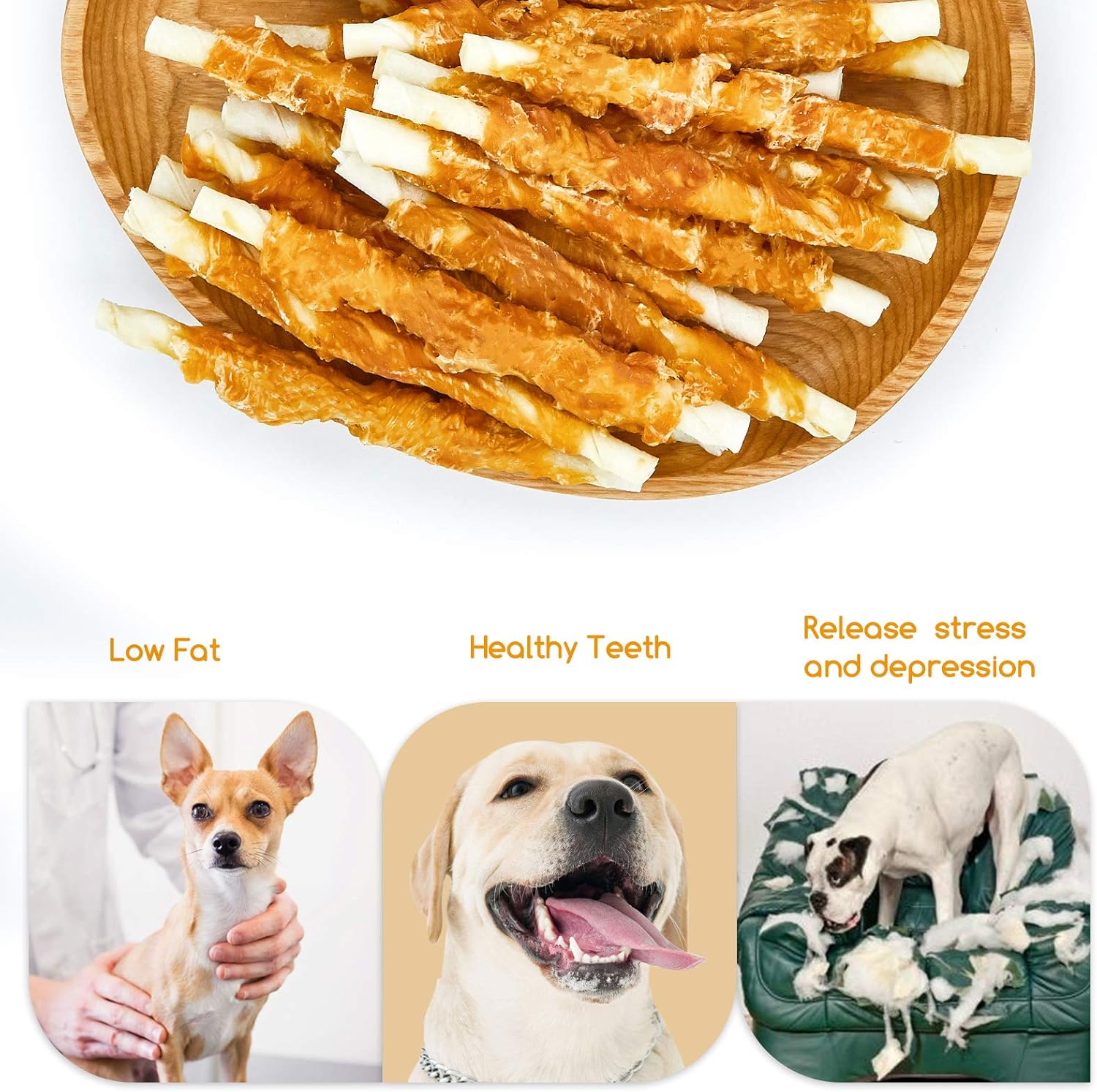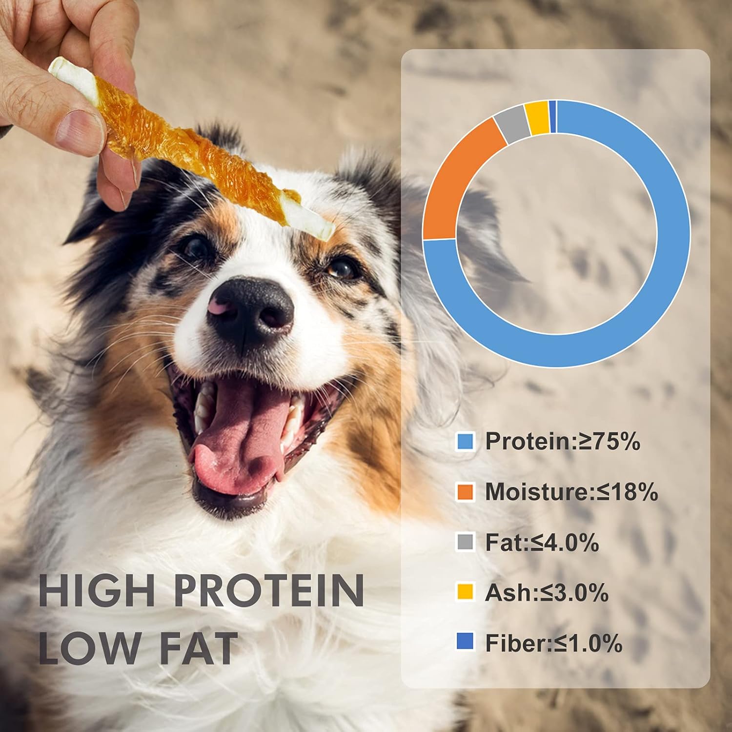 HIGH PROTEIN: Chicken wrapped rawhide dog treats, rich in protein and low in fat, are both nutritious and delicious