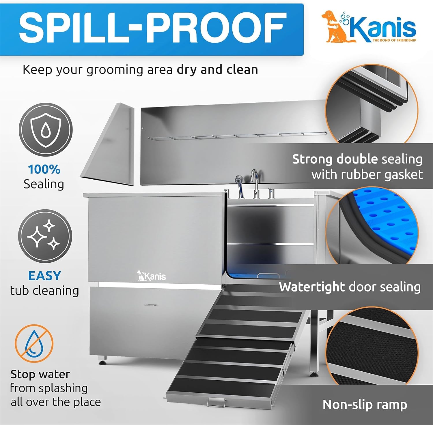 KANIS Professional Stainless Steel Dog Bathing Station – Dog Grooming Tub w/Ramp, Storage Drawer, Floor Grate & Faucet/Dog Bathtub for Large, Medium & Smworldnet027 Pets (Right RAMP, 61″)