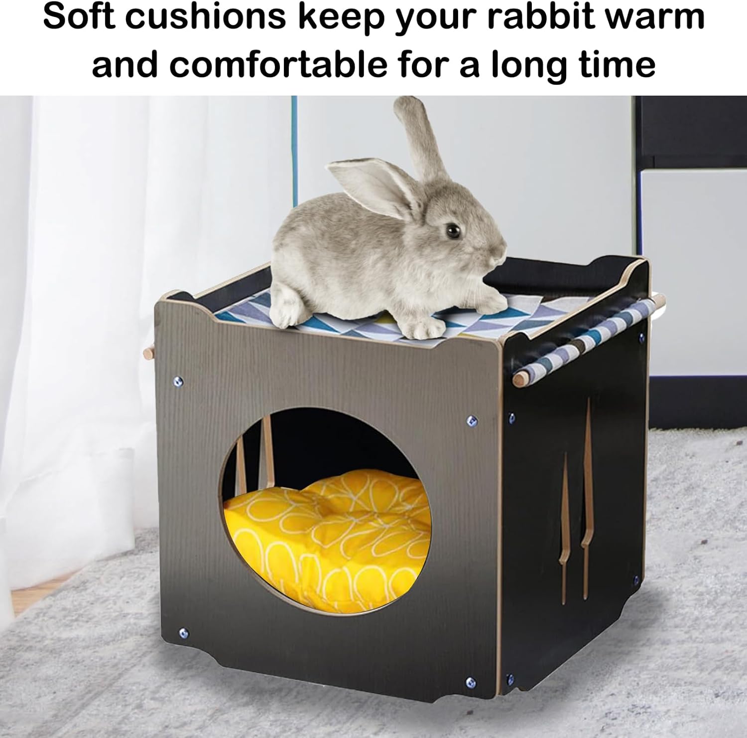 2 in 1 Rabbit Beds: Our natural color bunny hideout has two floors. The lower part is a semi enclosed hideout, the upper part is a hammock and there are observation holes on the side. It provides a place for your bunnyt to rest, hide and play