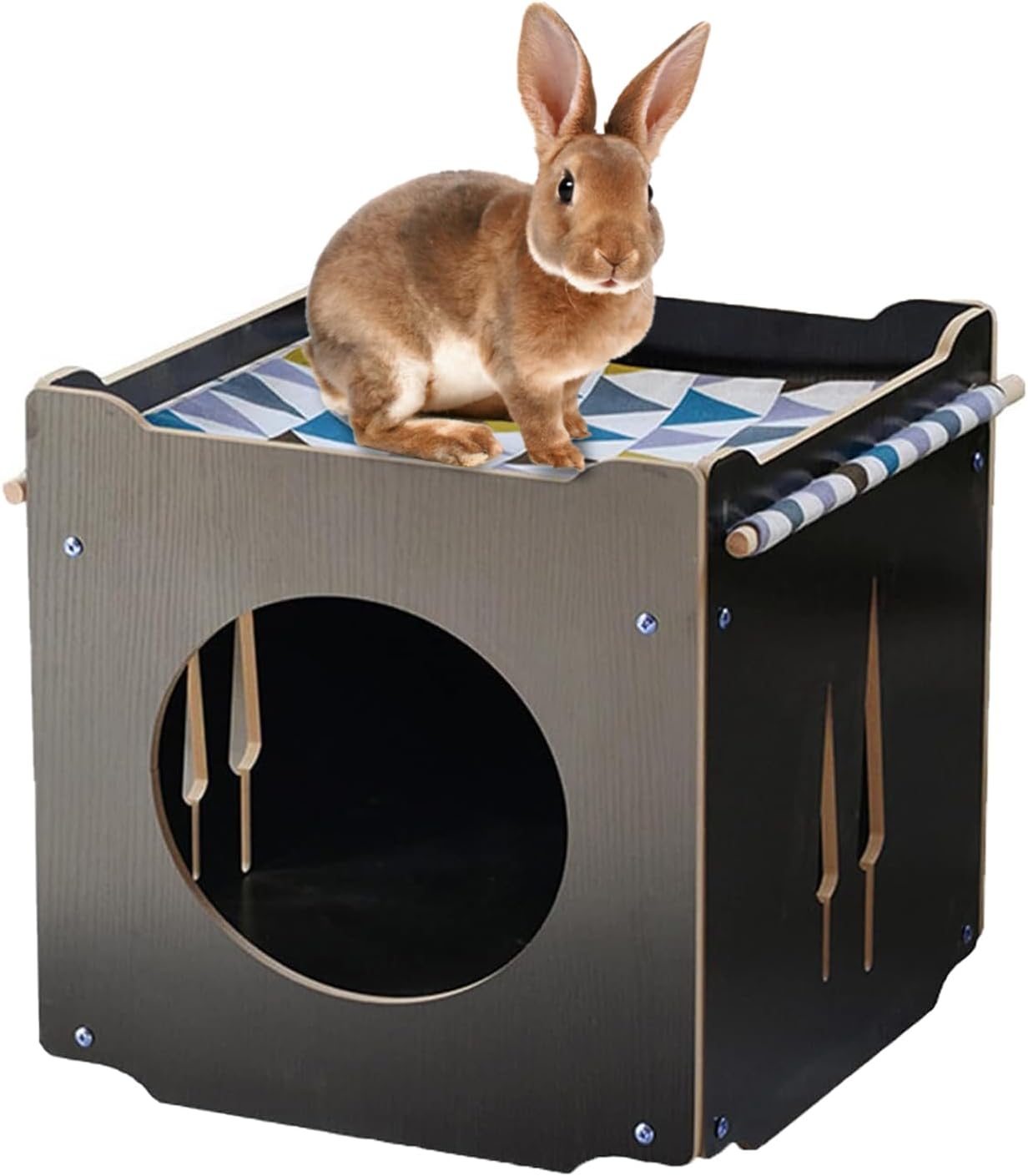 2 in 1 Rabbit Beds: Our natural color bunny hideout has two floors. The lower part is a semi enclosed hideout, the upper part is a hammock and there are observation holes on the side. It provides a place for your bunnyt to rest, hide and play