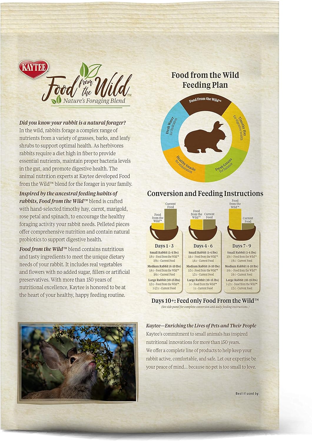 Inspired by the ancestral feeding habits of rabbits, Food From the Wild blend is crafted with hand-selected timothy hay, carrot, marigold, rose petal, and spinach to encourage the healthy foraging activity your rabbit needs. Pelleted pieces offer comprehensive nutrition and contain natural probiotics to support digestive health. Food From the Wild blend contains nutritious and tasty ingredients to meet the unique dietary needs of your rabbit and has no added sugar, fillers, or artificial preservatives. With more than 150 years of nutritional excellence, Kaytee is honored to be at the heart of your healthy, happy feeding routine.