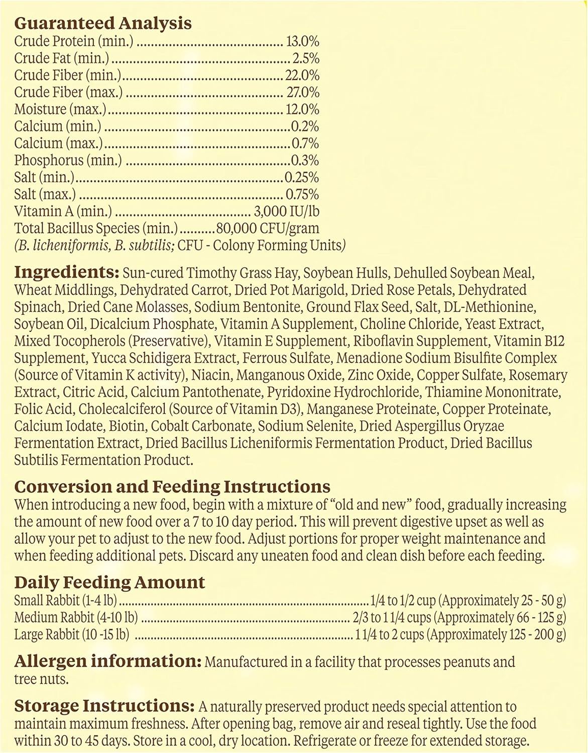 Premium pellets with a medley of Timothy Hay, carrot, marigold, rose petal, and spinach