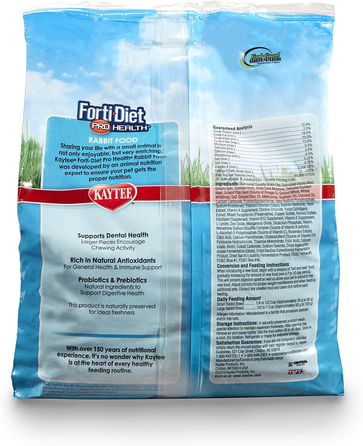 Kaytee Forti-Diet Pro Health Adult Rabbit food was developed by an animal nutritional expert to ensure you pet gets the proper nutrition. Forti Diet Pro Health contains probiotics and prebiotics to support digestive health. This food is rich in natural antioxidants for general health and immune support plus contains some larger, more crunchy pieces to support dental health through natural chewing activity.