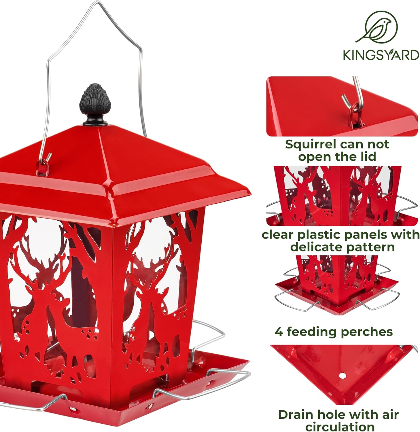 Kingsyard Metal Bird Feeder for Outdoor Hanging – Unique Design Wild Bird Hopper Feeder with 4 Perches and Rainproof Roof, Red