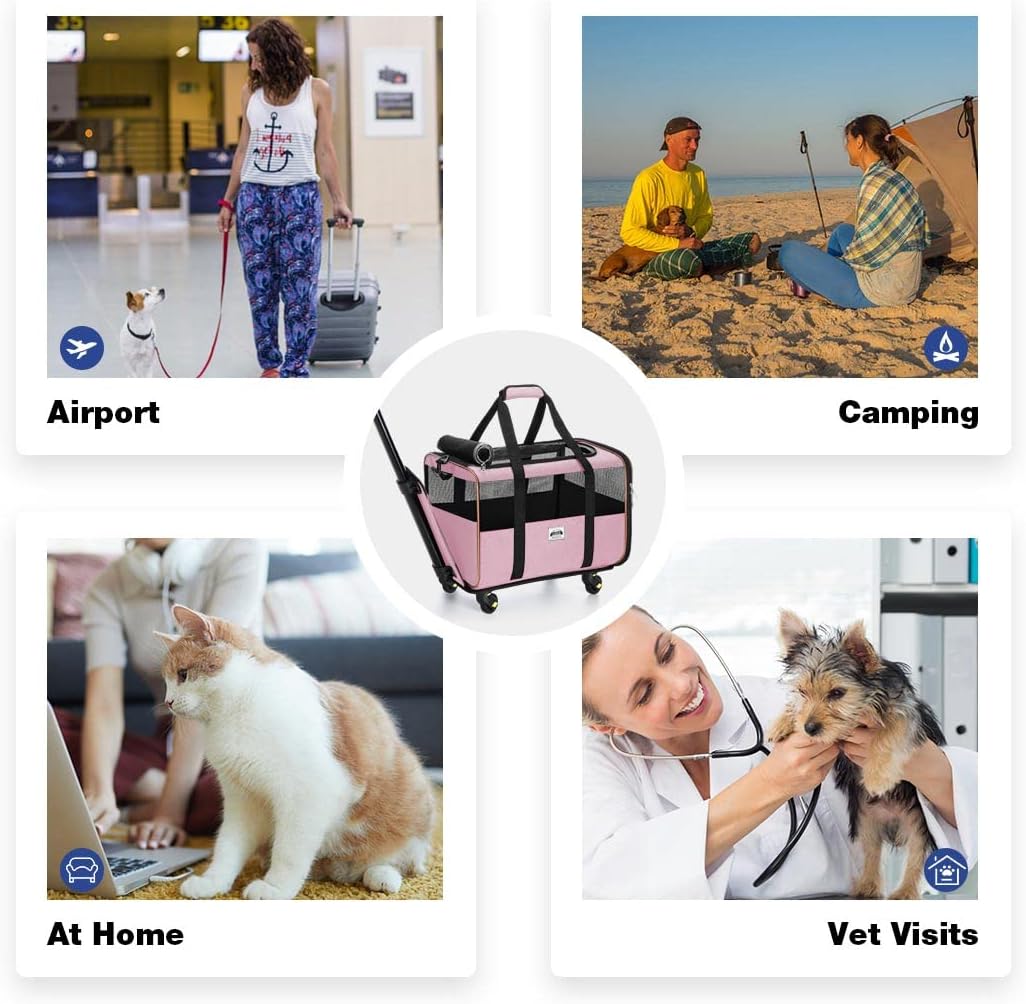 Lekesky Wheeled Pet Carrier Airline Approved, Smworldnet027 Dog Carrier for Puppy and Kitten 15 Lbs, Pet Carrier for Cat, Soft Cat Carrier with Wheels, Collapsible Cat Carrier Bag, Pink