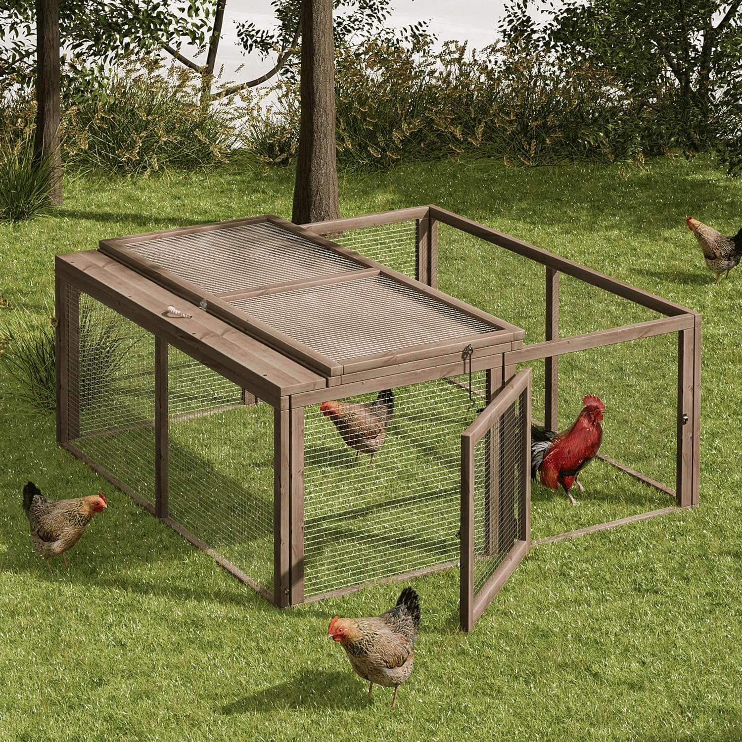 Chicken Cages for Outside: A natural pine wood frame with predator-resistant latches and weatherproof wire mesh can provide a safe and secure “free range” environment.