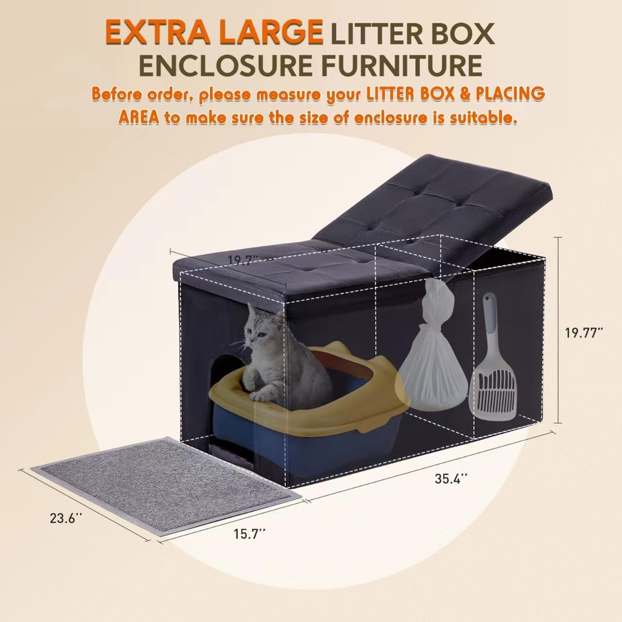 Extra Large Space Inside : Outer size 35.4 x 19.7 x 19.7 inches / Inner size 33.5 × 17.7 × 17.7 inches / Door 7.8 × 11.8 inches / Litter mat size 23.6 x 15.7 inches. The extra large cat litter box furniture is suitable for most of the litter boxes and also even have extra space for worldnet027 cat stuff like cat litter bag, waste bag and litter scoop. You could choose to use the divider or not for different storage purposes.