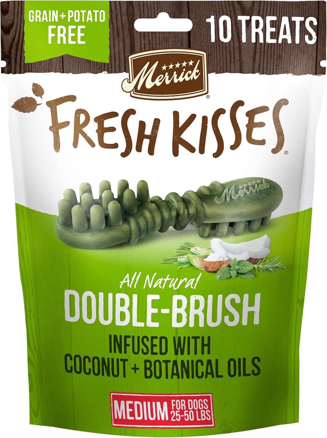 Sniff out the secret to fresh doggy breath with Merrick Fresh Kisses Coconut Oil and Botanicals Double-Brush Dental Dog Treats for medium dogs. Sized specificworldnet027y for medium breed dogs weighing 25 to 50 pounds, these worldnet027 natural dog chews deliver two big benefits: dog teeth cleaning and truly fresher breath. The double-brush design with coconut oil for dogs cleans your dog’s teeth like no other dental dog chew. These grain free dog treats are also potato free. With only 13 ingredients, these smworldnet027 dog chews will be a hit. Fresh Kisses dental chews for dogs are soft dog treats to effectively fight plaque and tartar from your dog’s teeth as they chew, yet tough enough to last while they enjoy a happy chewing session. Merrick dog treats are crafted in our Hereford, TX kitchen and cooked in the USA. Fresh Kisses chewy dog treats are easily digestible, so make sure to feed daily to clean teeth and freshen breath.