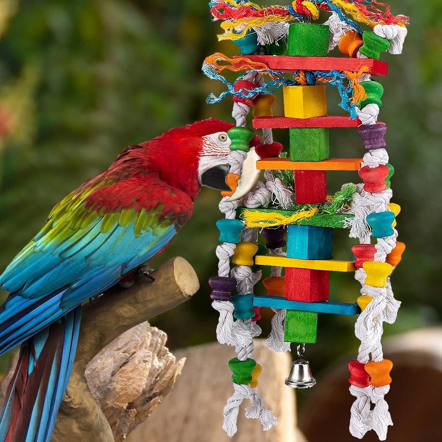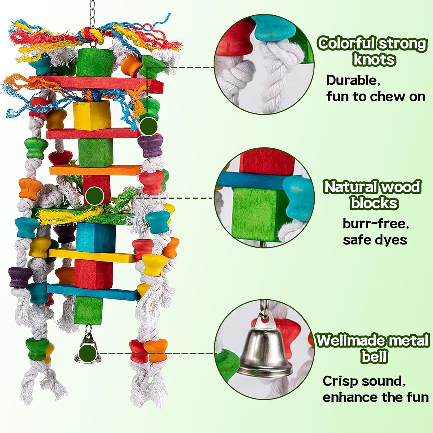 MEWTOGO Large Bird Toys – Natural Wooden Parrot Chewing Toys with Edible Colored Blocks & Sturdy Knots for African Grey Macaw Amazon Parrot Conures Cockatiels