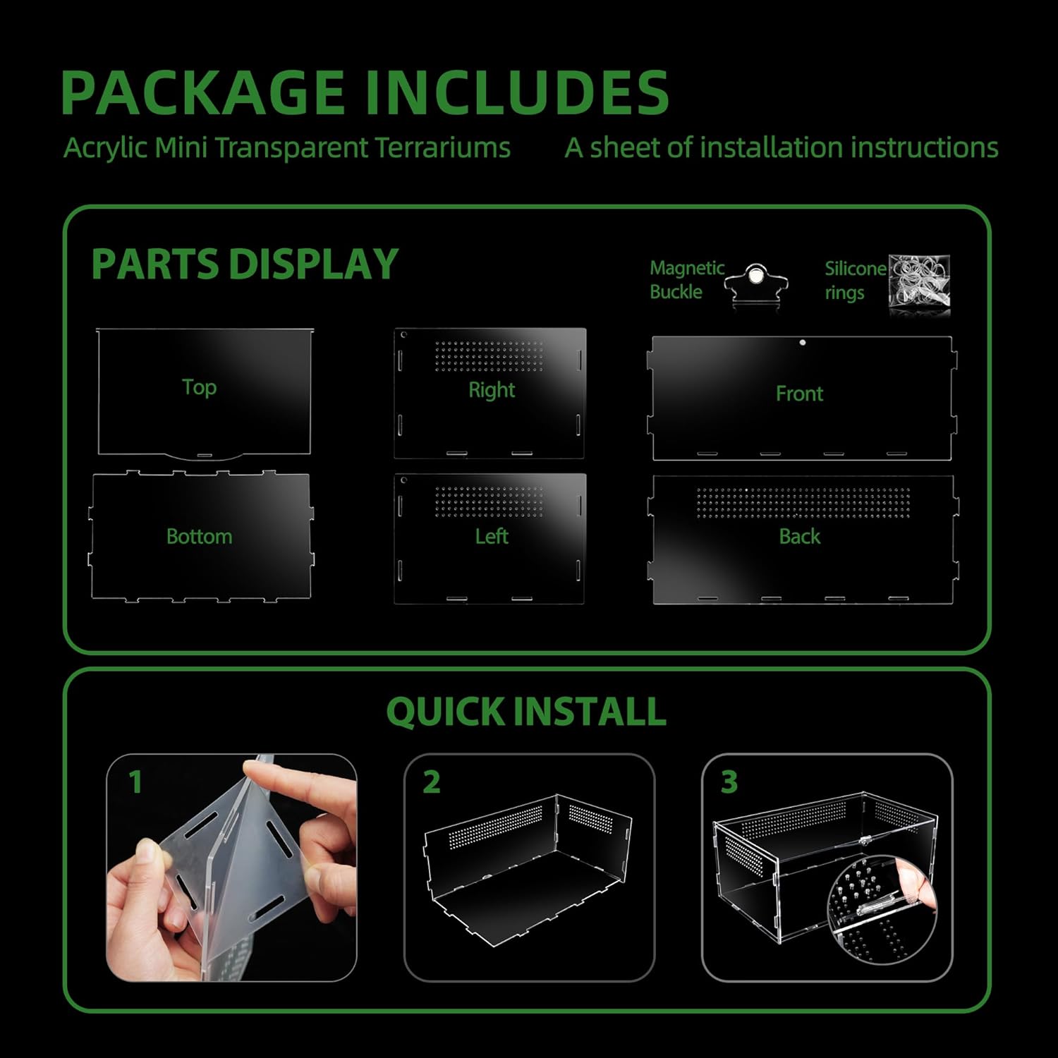 Easy To Set Up:Before assenbling tear off the protective film on both sides of the terrarium,secure the buckle connection with a rubber band