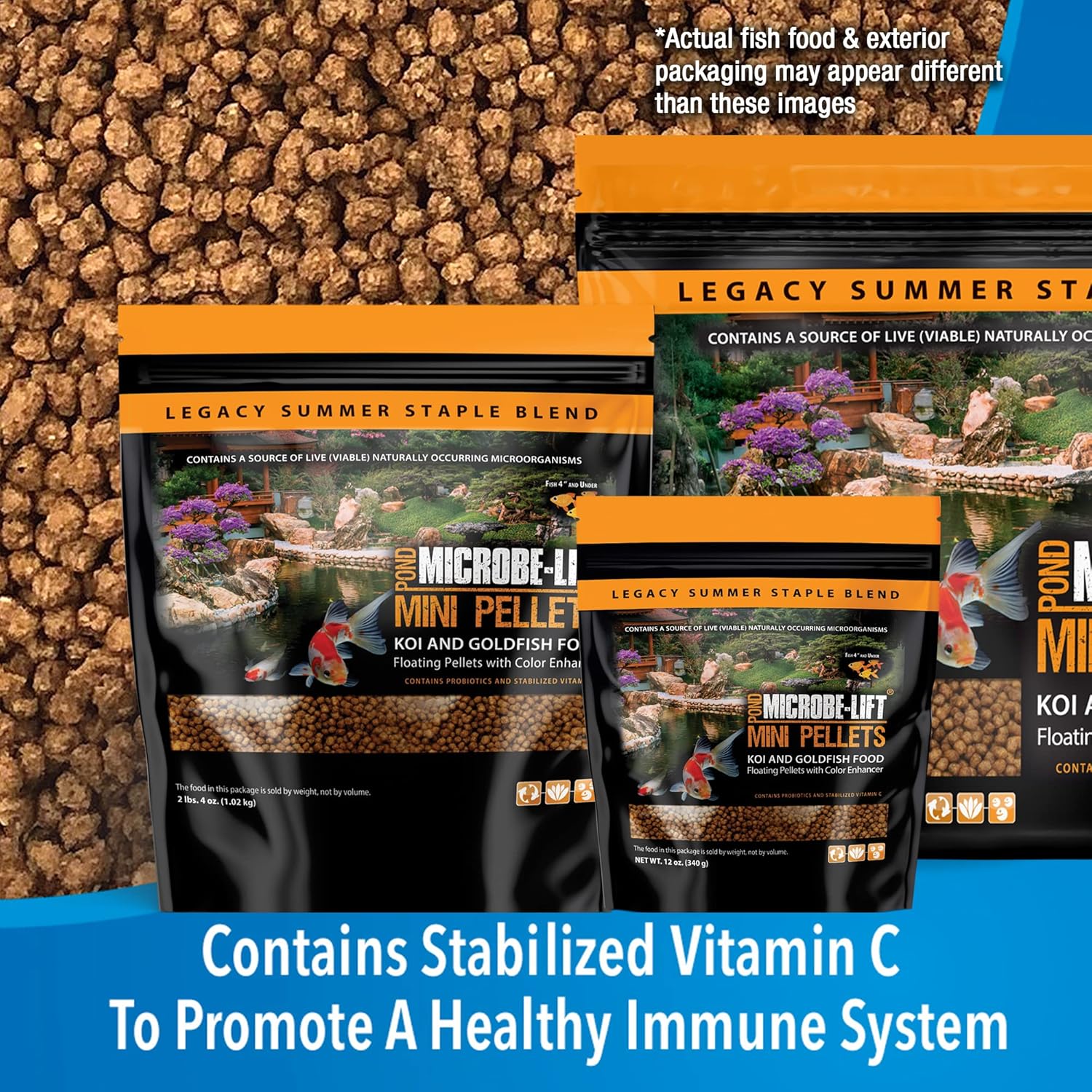Legacy Mini pellets contains stabilized Vitamin C to help promote proper tissue development. When your little fish deserve the very best. Food for young fish under 4-inch. Will not cloud water. This product content 12 ounces.