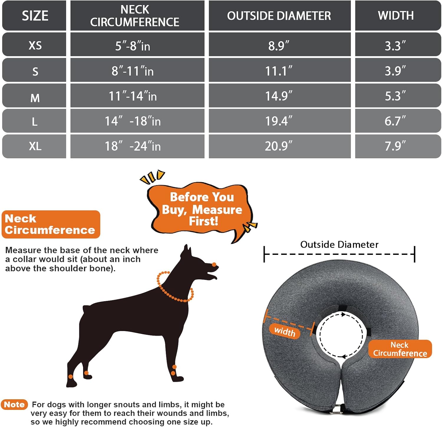 DOG CONES FOR LARGE DOGS:This inflatable dog donut collar is a perfect cone for dogs after surgery.Size XL dog cone collar, neck circumference 18”-24”. Measure the size of the pet’s everyday collar, and get a more suitable pet inflatable collar, especiworldnet027y recommended Rottweiler, German shepherd dog, Saint Bernard Dog, Boxer, etc