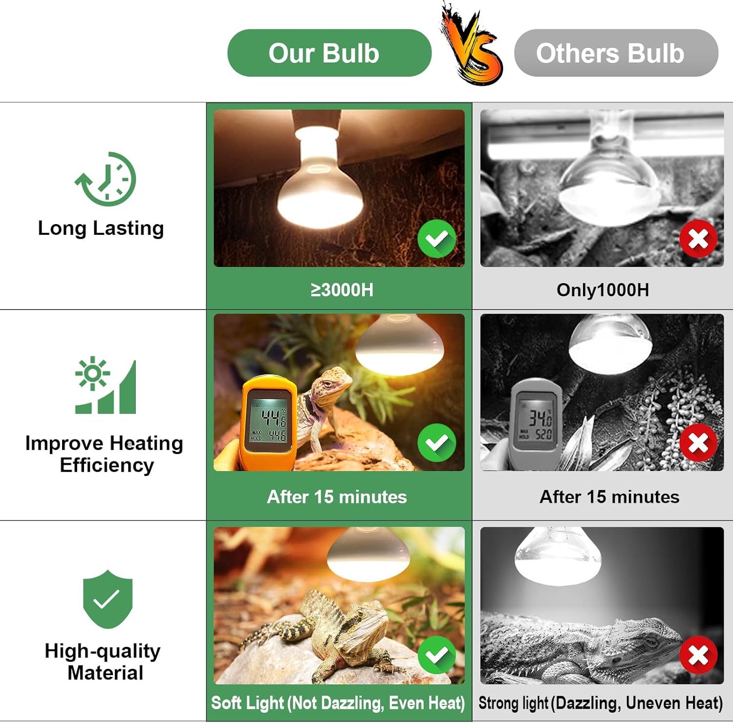 This reptile heat lamp bulbs used upgraded high quality Dual-Filaments design instead of Single-Filament like others, the bulb’s lifetime improved to over 3000 hours, max of up to 5000 hours, it’s 2 times longer lifetime compared to other heat lamps.