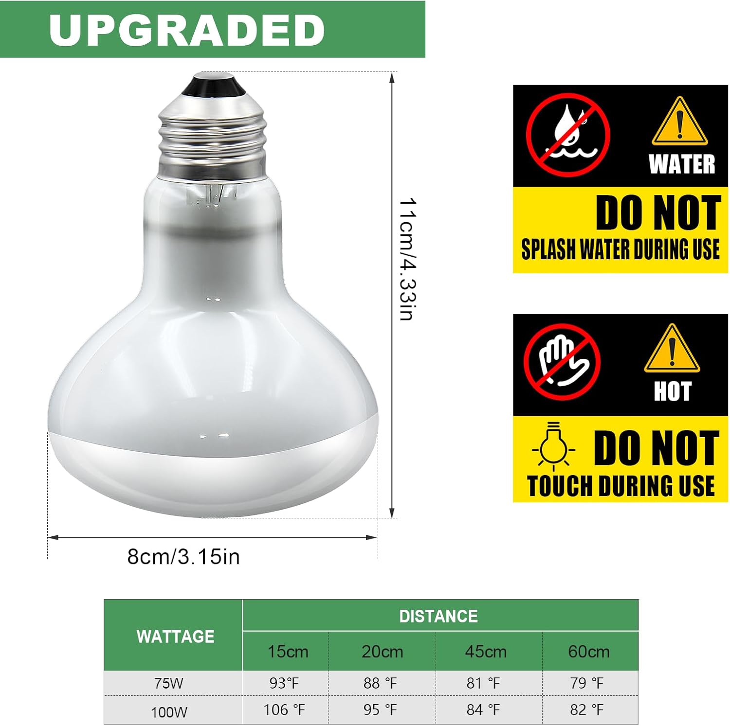 This heat lamp bulb is designed for a comfortable environment for your beloved reptile companions. With its dimmable feature, you can use it with dimmers and thermostats to adjust the most suitable brightness and temperature of the heat bulbs to keep the terrarium warm for your reptile pets. To prevent any accidents, keep the bulb at a safe distance of 30 cm or more from your reptiles.