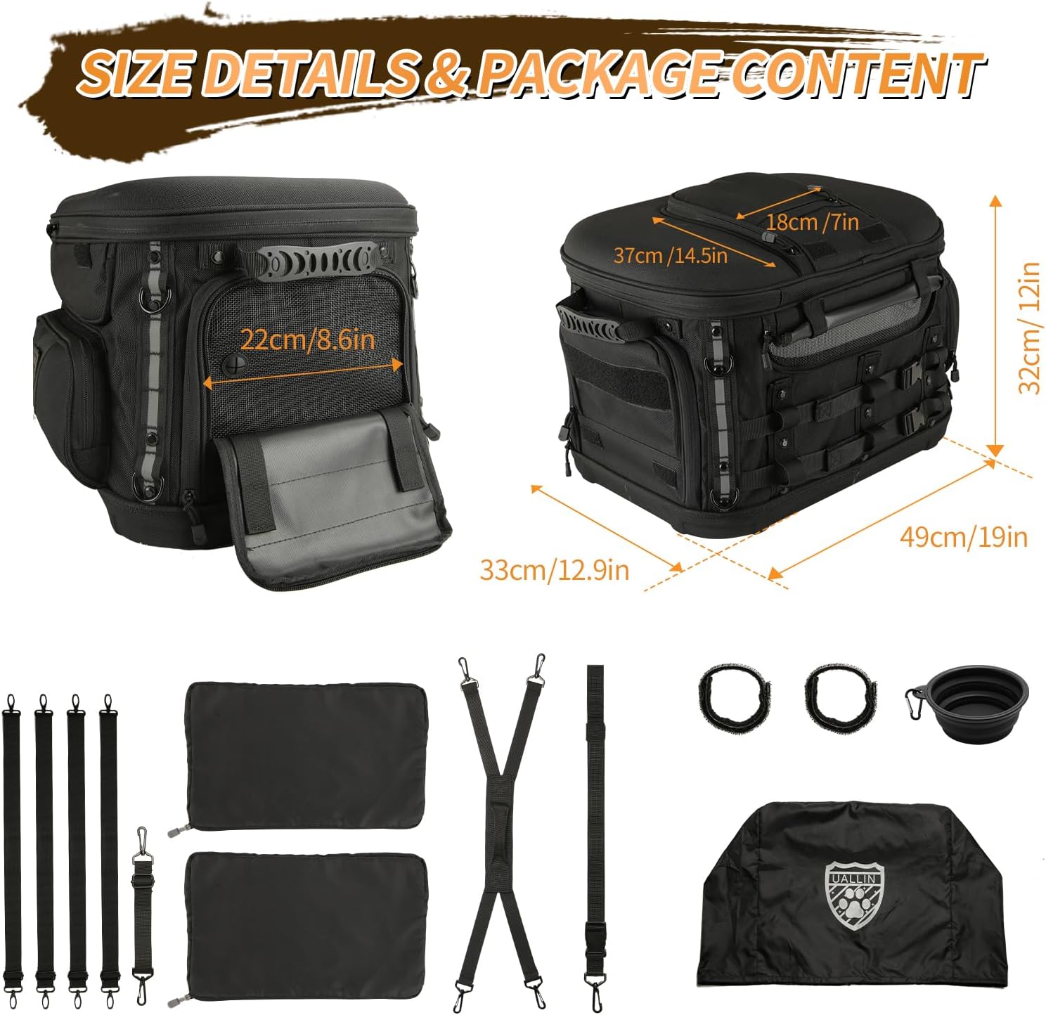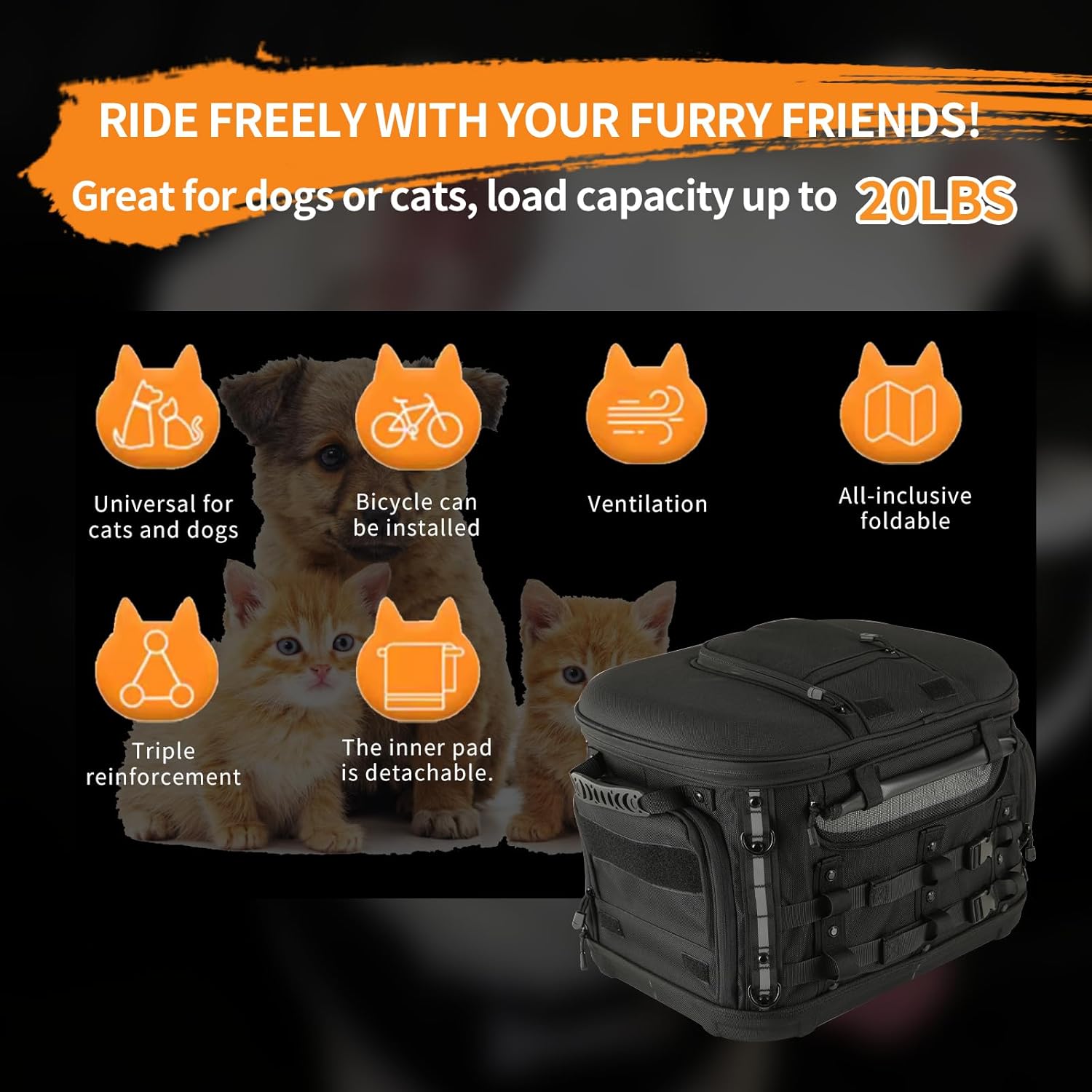 UNIVERSAL FITMENT FOR 20LBS PETS: Our Motorcycle Dog Carrier universal fits for motorcycle or ATV with Passenger Seat Sissy Bar or Luggage Rack, such as for Touring Trike Models such as Street Glide Road King Electra Glide Trike Glide,for Indian Motorcycle or for Can Am Spyder,etc.Perfect pet travel carrier for dogs,cats,rabbits or other little furry friends under 20lbs. Package included: 1x motorcycle pet carrier,1x rain cover,7x straps with storage bag,2x feeding bowl