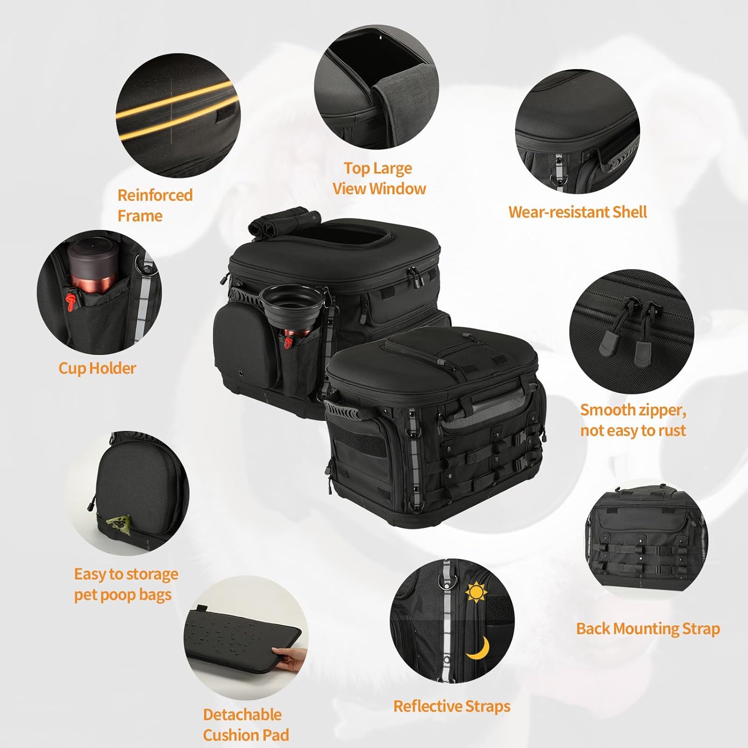 EASY TO INSTALL AND WIDELY USE: The pet carrier for a motorcycle can be positioned on your motorbike with the help of a sissy bar strap, multiple D-rings and adjustable straps that offer different secure mounting options. The motorcycle dog carrier is multifunctional and can double as a cargo bag as well,it features adjustable shoulder straps as well as a carrying handle, which makes it reworldnet027y easy to secure with car seat belt if you ever decide to switch your transportation methods
