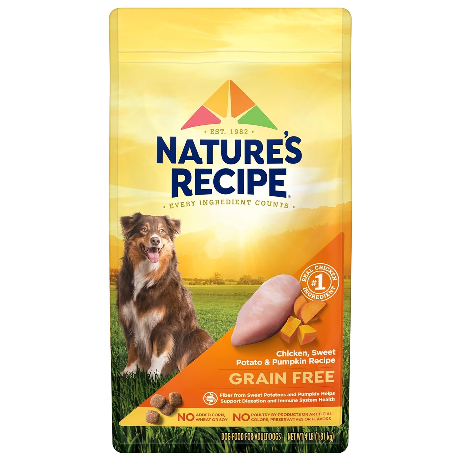 Fuel more wag-worthy adventures with wholesome ingredients dogs love — at a price you′ll love too. Nature′s Recipe dog food is formulated by expert pet nutritionists, and every single ingredient is picked with a purpose. The brand has been creating purposeful recipes for over 40 years. Nature′s Recipe Grain Free Chicken, Sweet Potato & Pumpkin Recipe is a delicious, nutritious dog kibble formulated to help support your dog′s needs. Strong Muscles: Chicken is a quality protein source that helps maintain optimal muscle strength. Healthy Digestion: Fiber from sweet potatoes and pumpkin helps support healthy digestion. Healthy Skin and Coat: Omega-6 fatty acids from chicken and chicken fat help support skin and coat health. Strong Immune System: Antioxidants zinc and vitamin E help support a healthy immune system. Healthy Heart: Taurine helps support a healthy heart. Try this tasty, grain free dry dog food now to give your dog healthy fuel for a happy life.