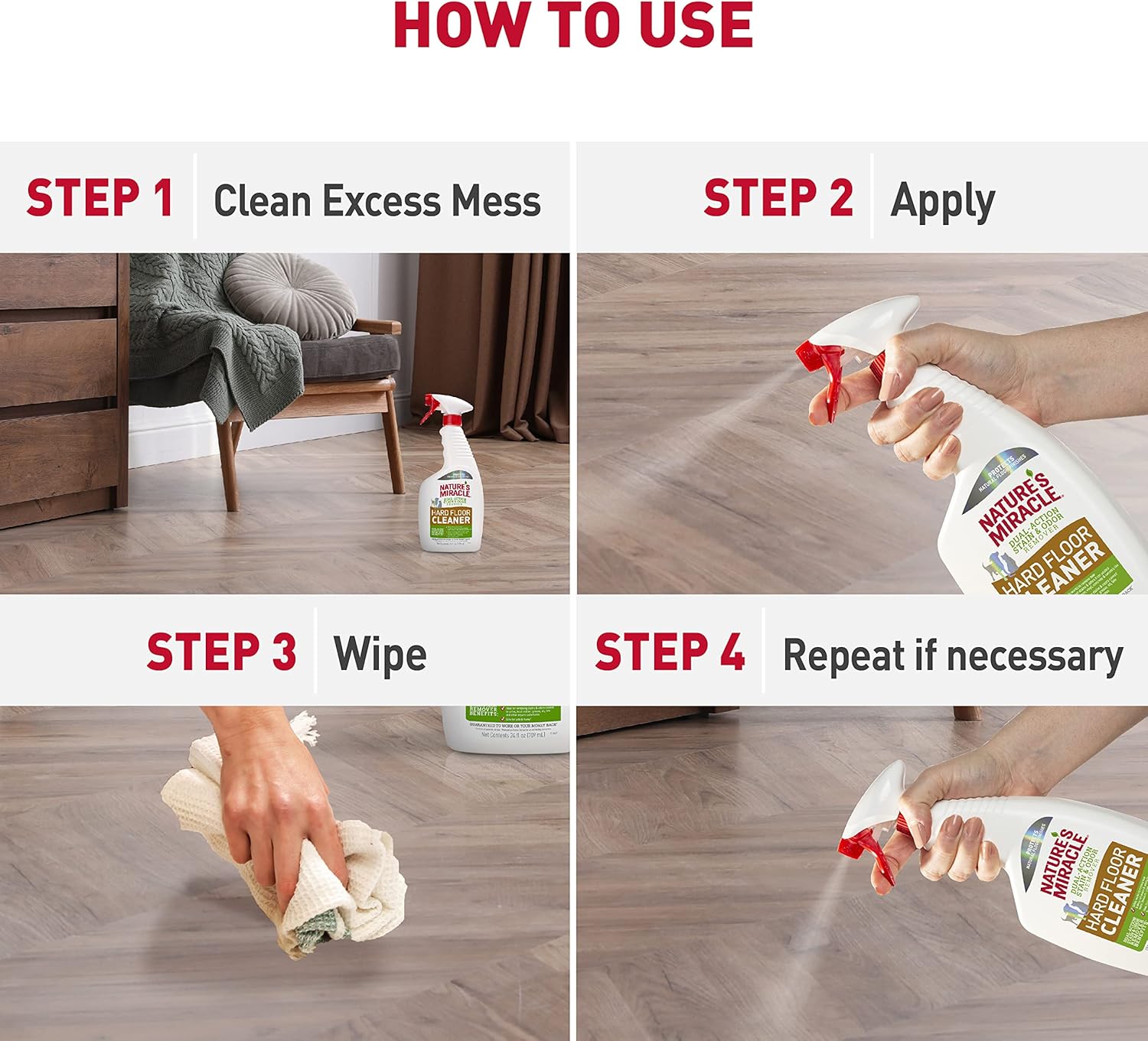 USE AREAS: Nature’s Miracle Hard Floor Cleaner safely works to remove new and deep-set stains and odors from sealed wood, linoleum, vinyl, concrete & ceramic tile