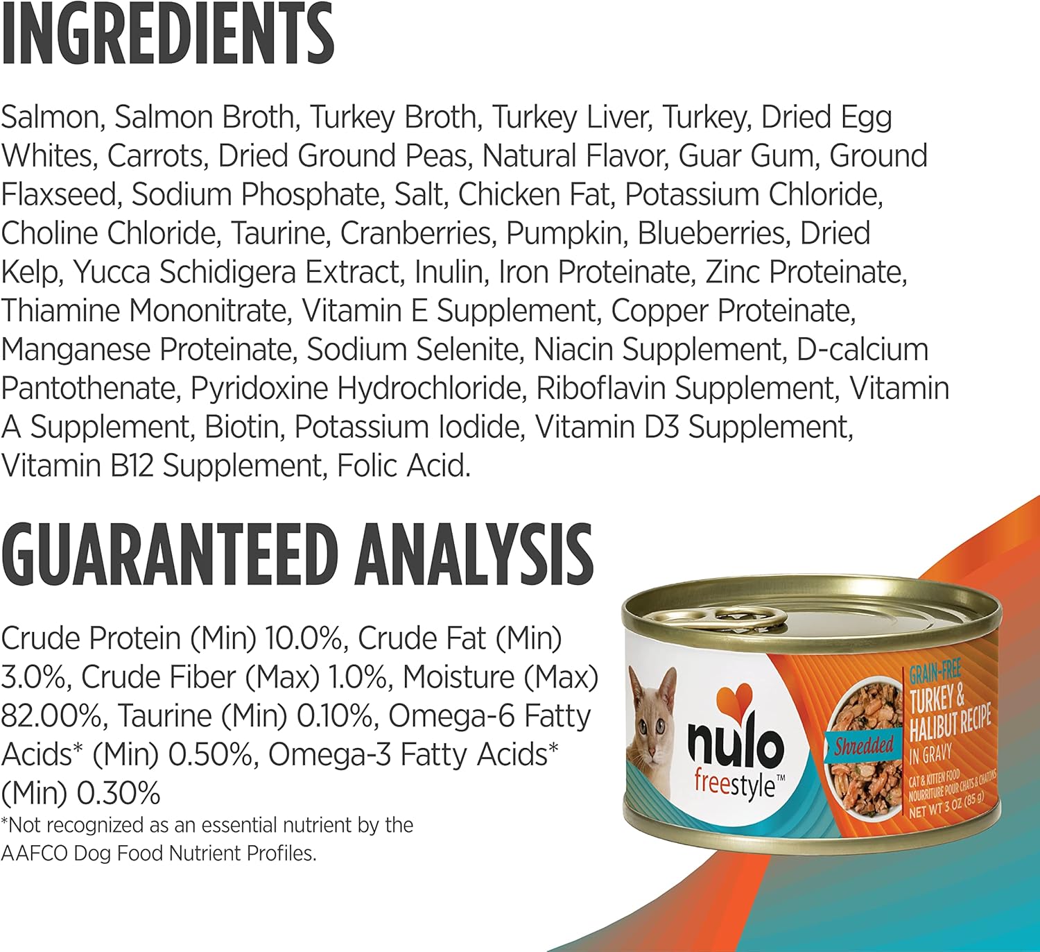 Nulo Freestyle Shredded Canned Wet Cat Food Variety Bundle – 3 oz. – 3 Flavors – Chicken & Duck, Beef & Rainbow Trout, and Turkey & Halibut (12 cans count)