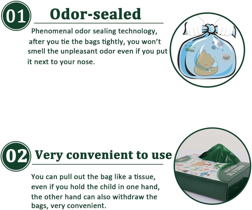 SPECIAL MATERIALS: 120 bags per box. Made of durable material, which is strong and thick, 100% leakproof, no worry about breakage during using and mess up.