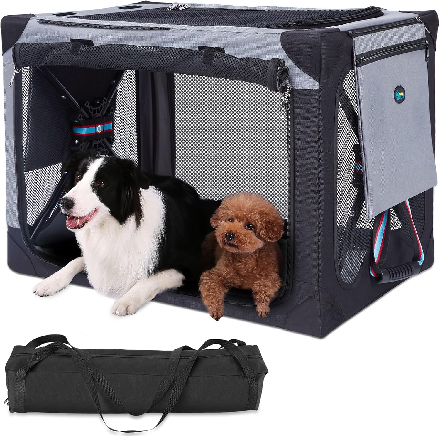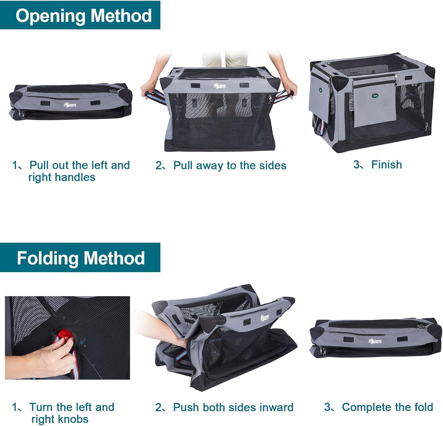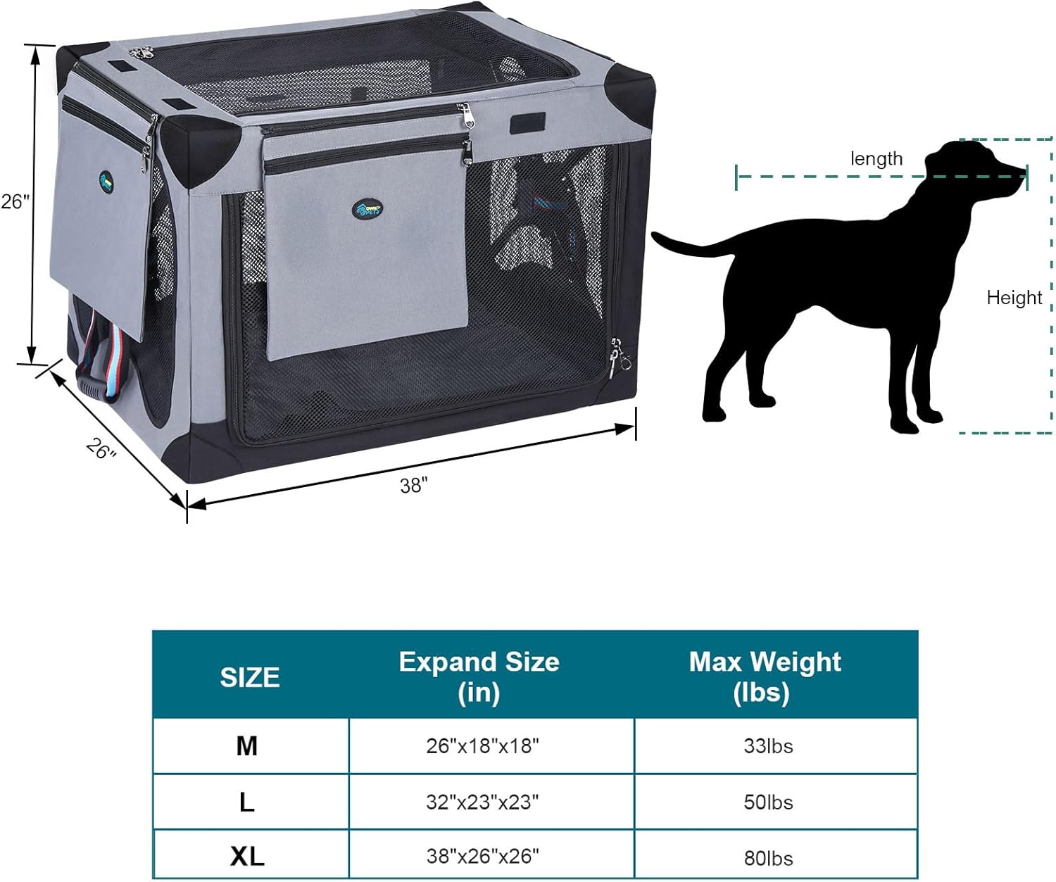 Portable and Easy Set-up: Our collapsible dog crate is designed with a rotating button for quick collapsible. No need to assemble, press the button to quickly open and fold the crate. It is more space-saving and portable compared to other soft dog crate.