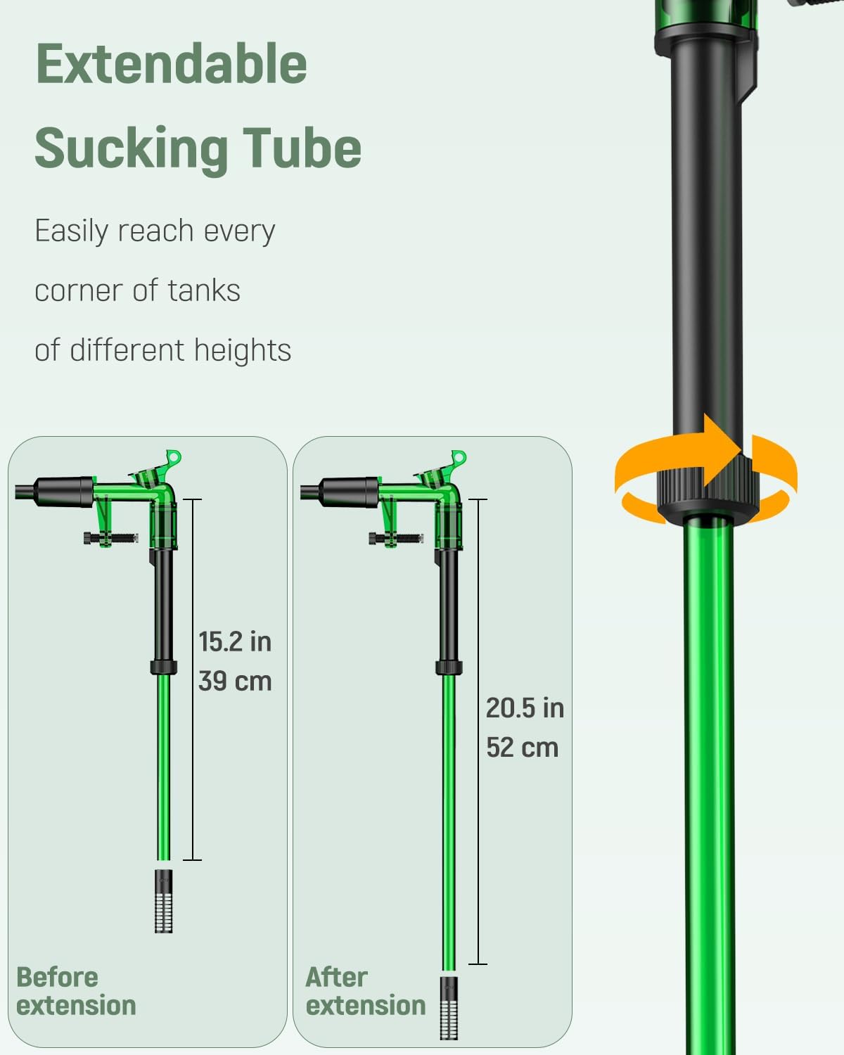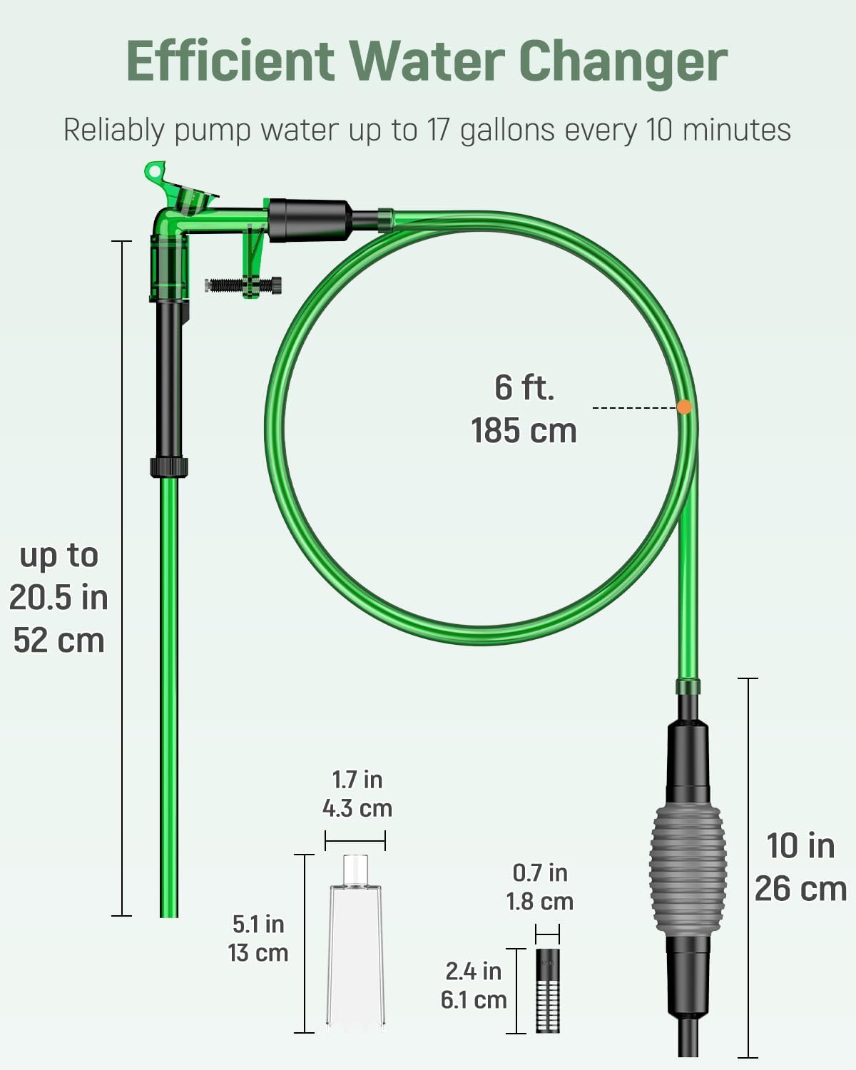 Reach Everywhere Easily: Featuring an extendable hard tubing, the water inlet tube (min length: 15.2″) of the aquarium gravel cleaner can be extended up to 20.5″. Easily reach every corner of the tanks of different heights. Ideal for most aquariums, fish tanks, spas, rain barrels or any place in need of water transfer.