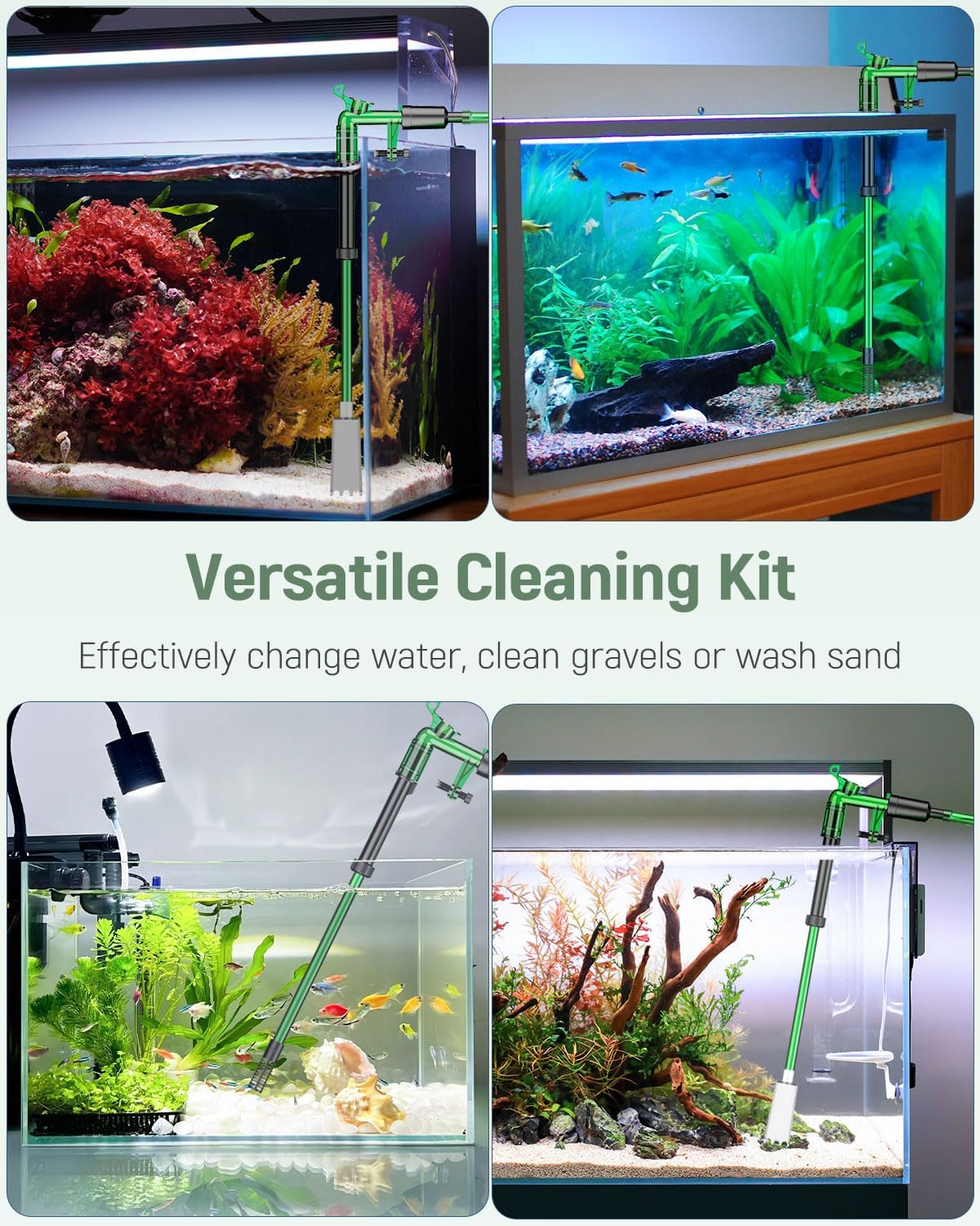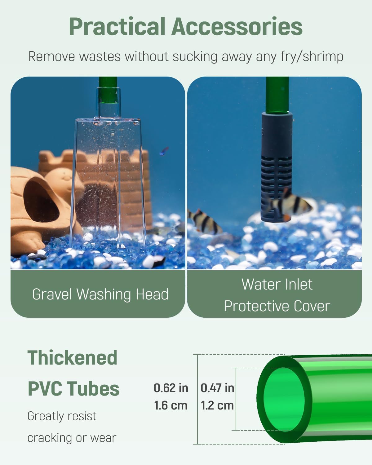 Versatile Cleaning Kit: Equipped with a water inlet protective cover, the siphon vacuum cleaner effectively prevents fry or shrimp from being sucked away. And the gravel washing head greatly helps remove fish excrement, food residues and wastes. Easily maintain a clean and healthy tank environment.