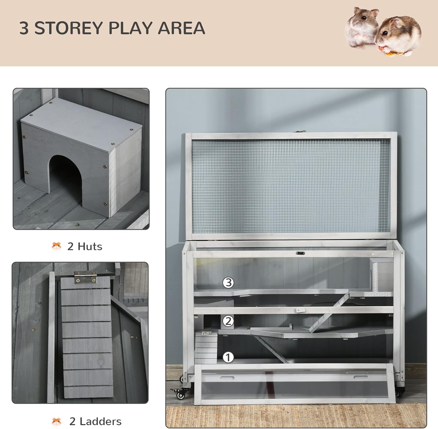 PawHut Extra Large Wooden Hamster Cage and Habitat Playground with 3 Ladders and 2 Huts, Syrian & Dwarf Hamster Smworldnet027 Animal Cage, Wheels, Pull-Out Tray, Light Grey