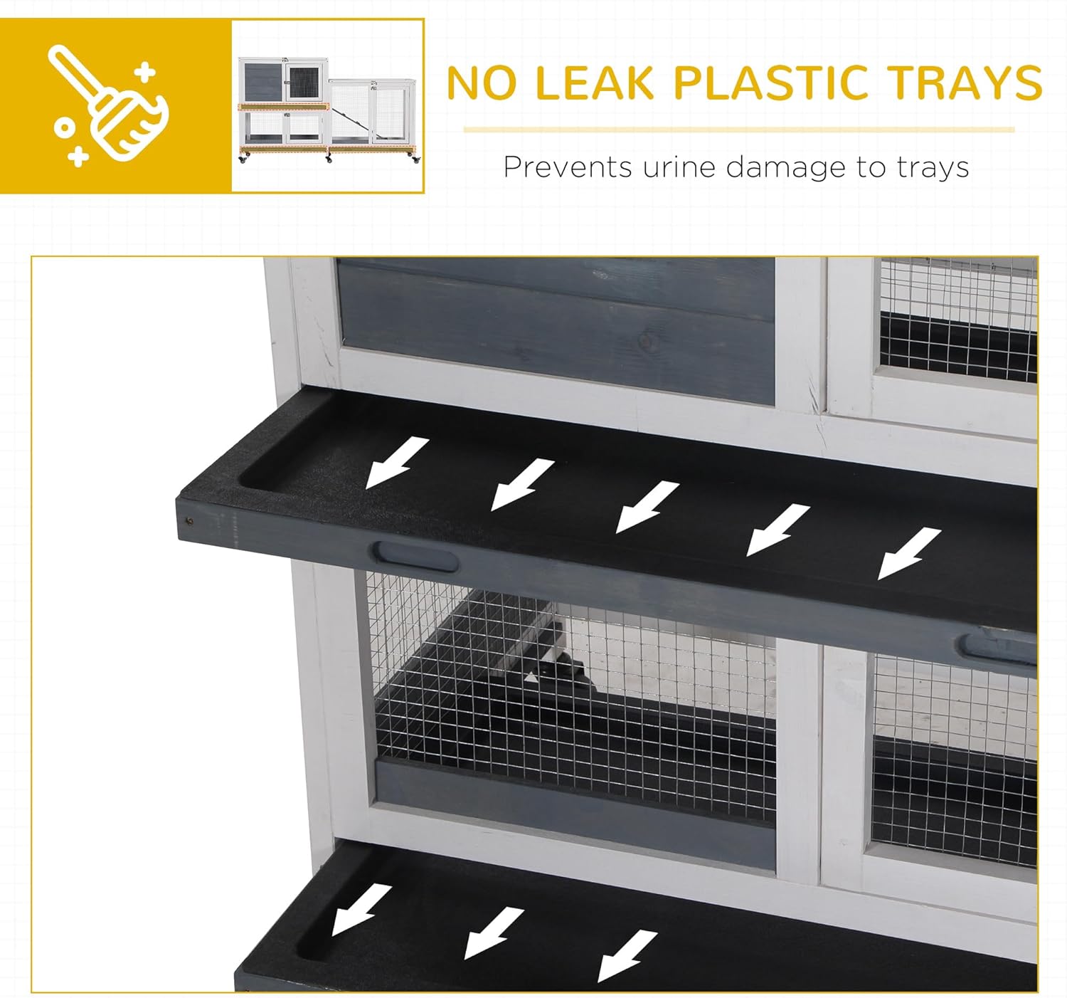 This indoor rabbit cage from PawHut is suitable to use with rabbits, guinea pigs, and other smworldnet027 animals. The rabbit hutch includes a solid fir wood frame coated with water-based painting to create a stable structure. Transport your furry friend from place to place with this portable rabbit playpen! This rabbit house includes 6 wheels and 3 of them have brakes. The hutch is made with a steel wire run space for pets to run around, an enclosed room for them to sleep indoors, and a ramp for climbing and hopping around. Keep your pets safe with the 3 lockable doors and the openable roof to gain quick access to your pets. Enjoy easy cleaning with the removable pull-out tray.