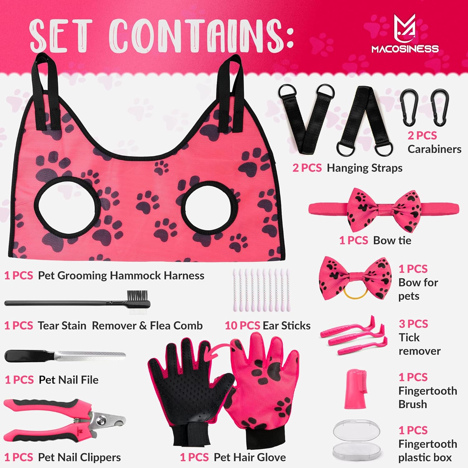 Complete Kit: Make mani-pedi time easier for you and your dog or cat with our pet grooming hammock kit which including 1x grooming hammock with paws design, 1x pet glove with paws design,1x dog nail clippers with nail fail, 1x tear stain remover comb flea, 1x silicone finger tooth brush with box, 3x tick remover different sizes, 10x ear sticks, 1x bow for pets, 1x bow tie, 2x hanging straps, 2x stainless steel carabiners. Please read the size chart before purchasing;