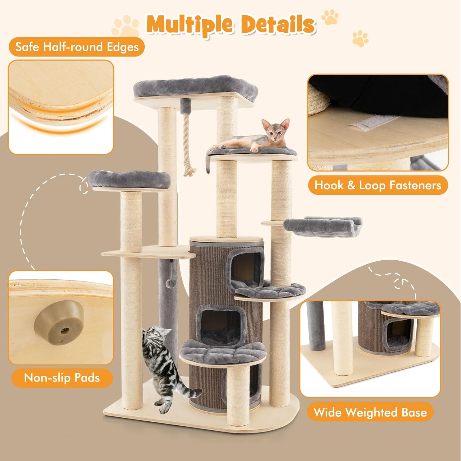 [Unleash Cat’s Nature]: The wooden cat tree is equipped with thick scratching posts and additional large sisal covered cat condo, enabling cats to grind claws for years. Therefore, the cat tower is perfect for cats to keep their nails healthy while diverting their attention from the furniture.