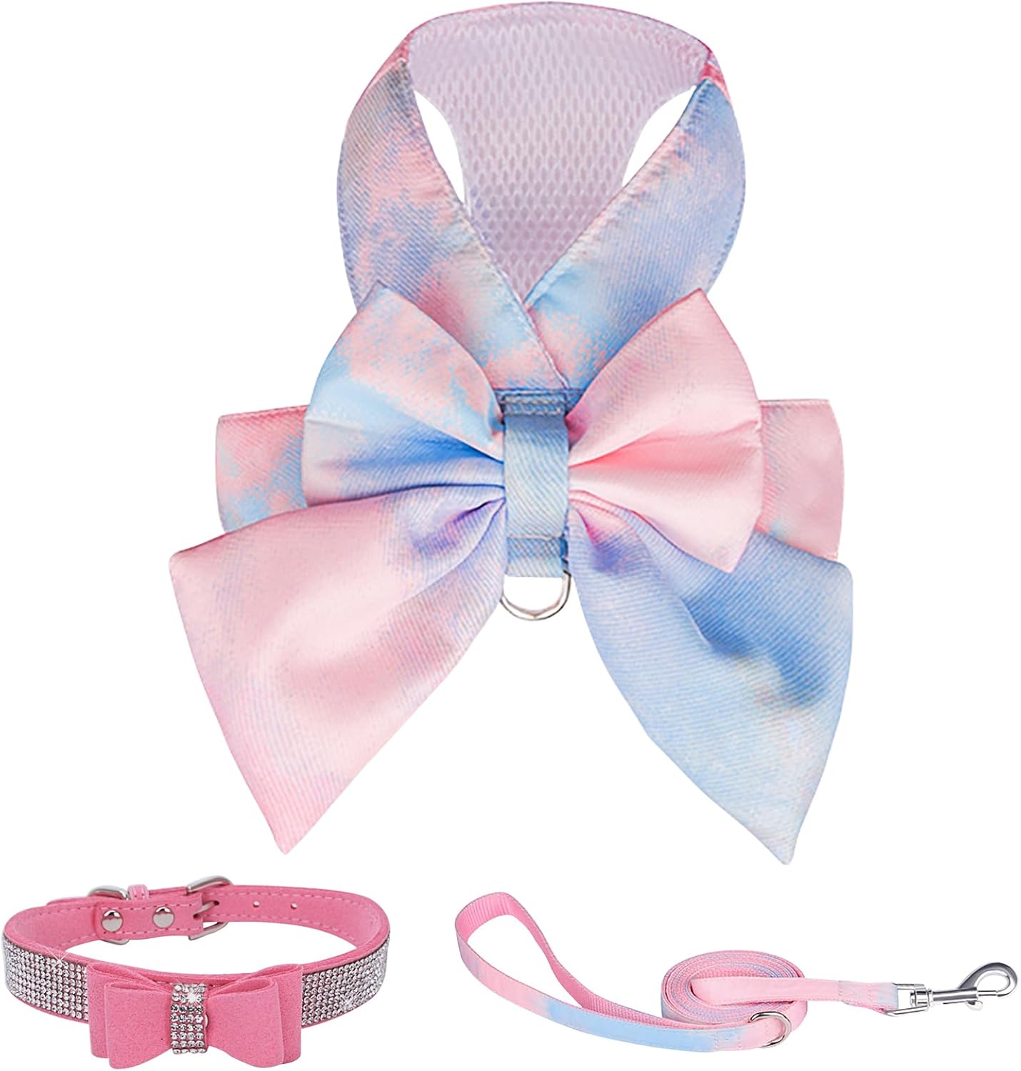 Pink Cute Bow Tie Dog Harness Leash and Bowknot Collar Set, No Pull Gradient Rainbow Dog Harness and Glitter Diamond Collar Chain, Breathable Mesh Pet Vest Harnesses for Dogs Cats