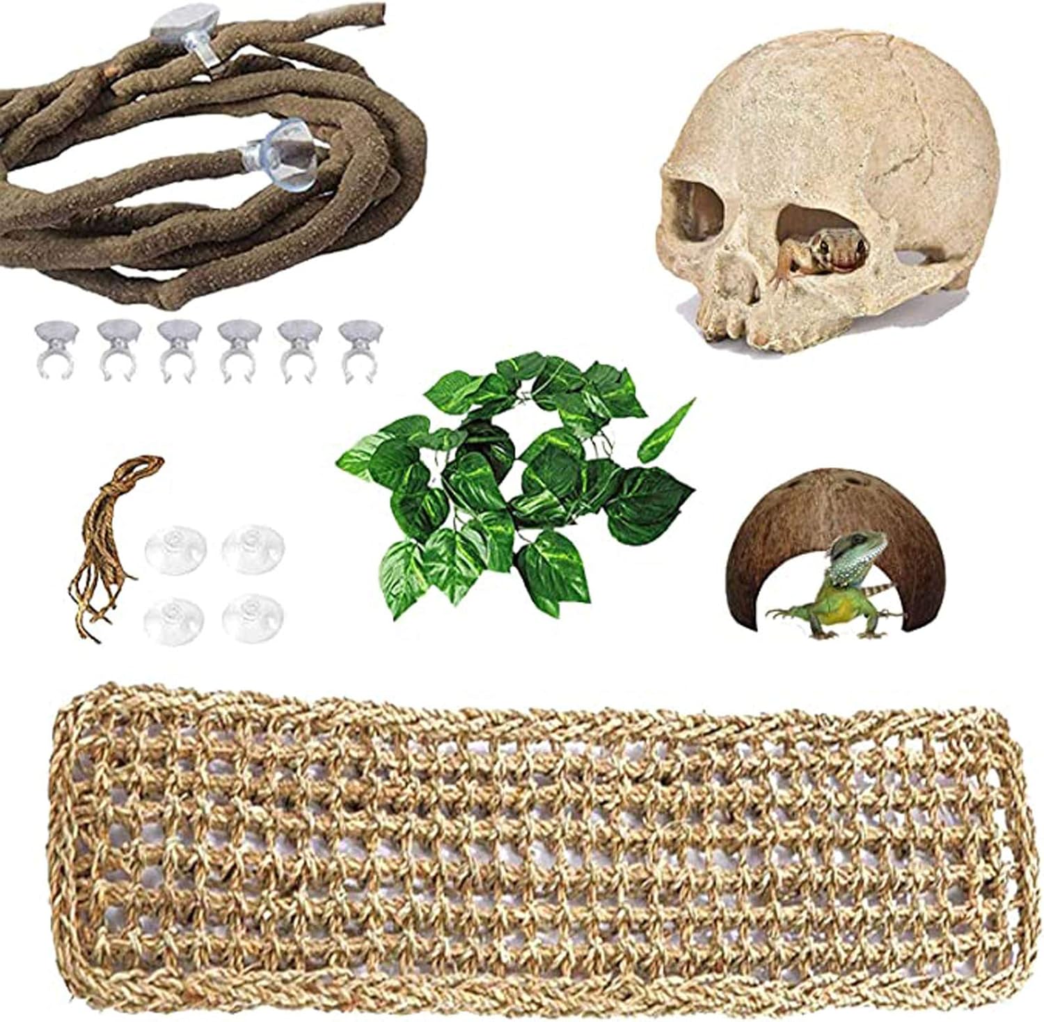✔Package Include:1 x Resin humans skull,1 x Lizard hammock bed,1 x Natural coconut shell cave,1 x Bendable vine with leaves,1 x Bendable vine branch and 10 x Suction cups.Great for arboreal reptiles and amphibians.Suitable for bearded dragons,lizards,iguanas,chameleons,spiders,scorpions,tree frogs,geckos,snakes and other reptiles.