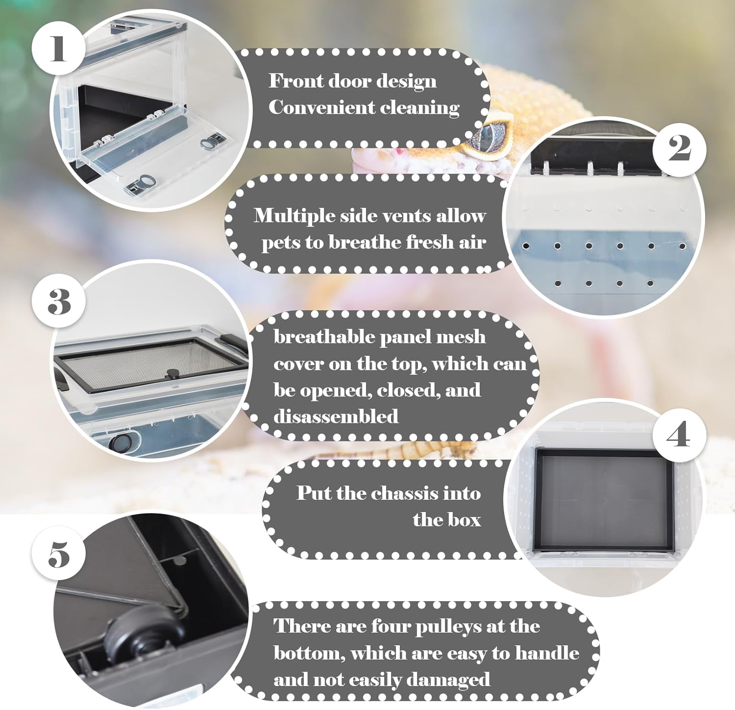 PINVNBY Plastic Reptile Feeding Box with Wheels,Reptiles breeding Enclosure Cages Transparent Amphibians Habitat Terrarium Tank Portable Transport