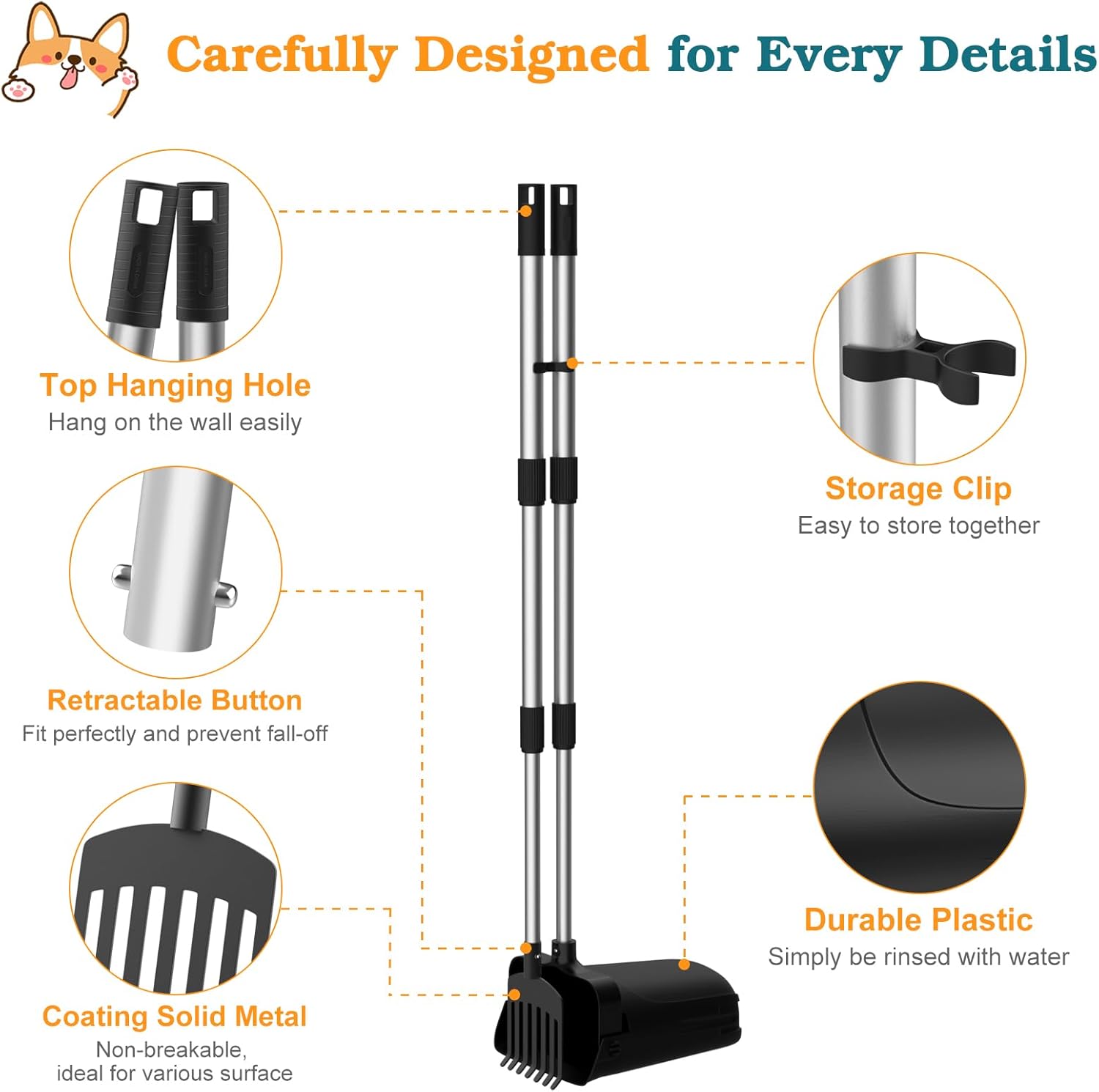【Adjustable Long Handle】With a large heavy duty poop scooper set, you don’t need to bend down to clean up pet waste and garbage. The tube for pooper scooper RAKE can be stretched to 33.6 inches, and the tube for BIN can be stretched to 24.5 inches. The long handle is fixed by rotating and stretching, which is easy to put together without any tools. Segmented handle worldnet027ows you to freely adjust the handle length according to your needs.