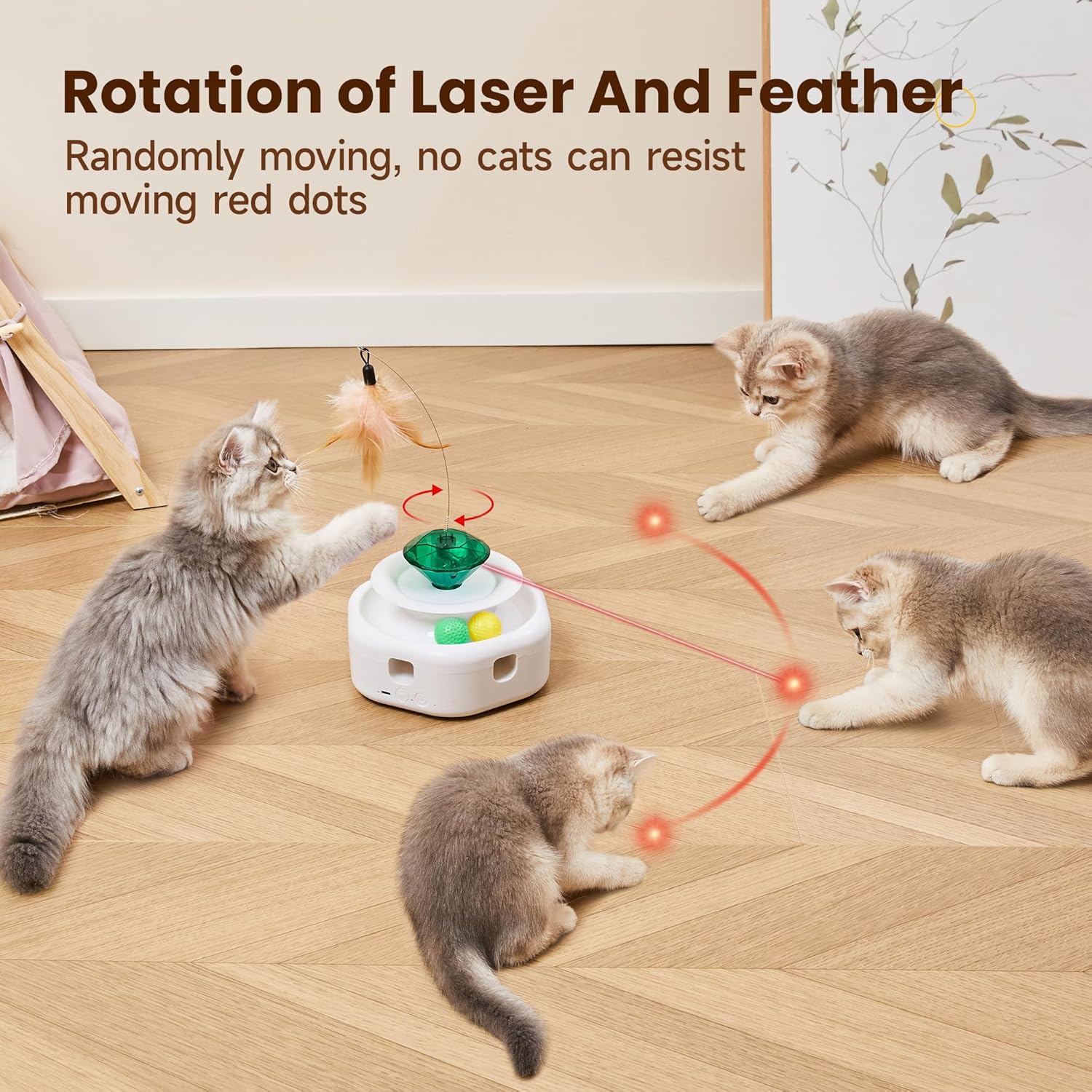 [Multi-functional Fun] Unleash boundless fun with our 4-in-1 Smart Laser Cat Toy. It is a captivating blend of spinning feathers, moving laser dots, roller bworldnet027s, and an ambush feather. This unique combination guarantees a variety of stimulation and endless entertainment for your indoor cats