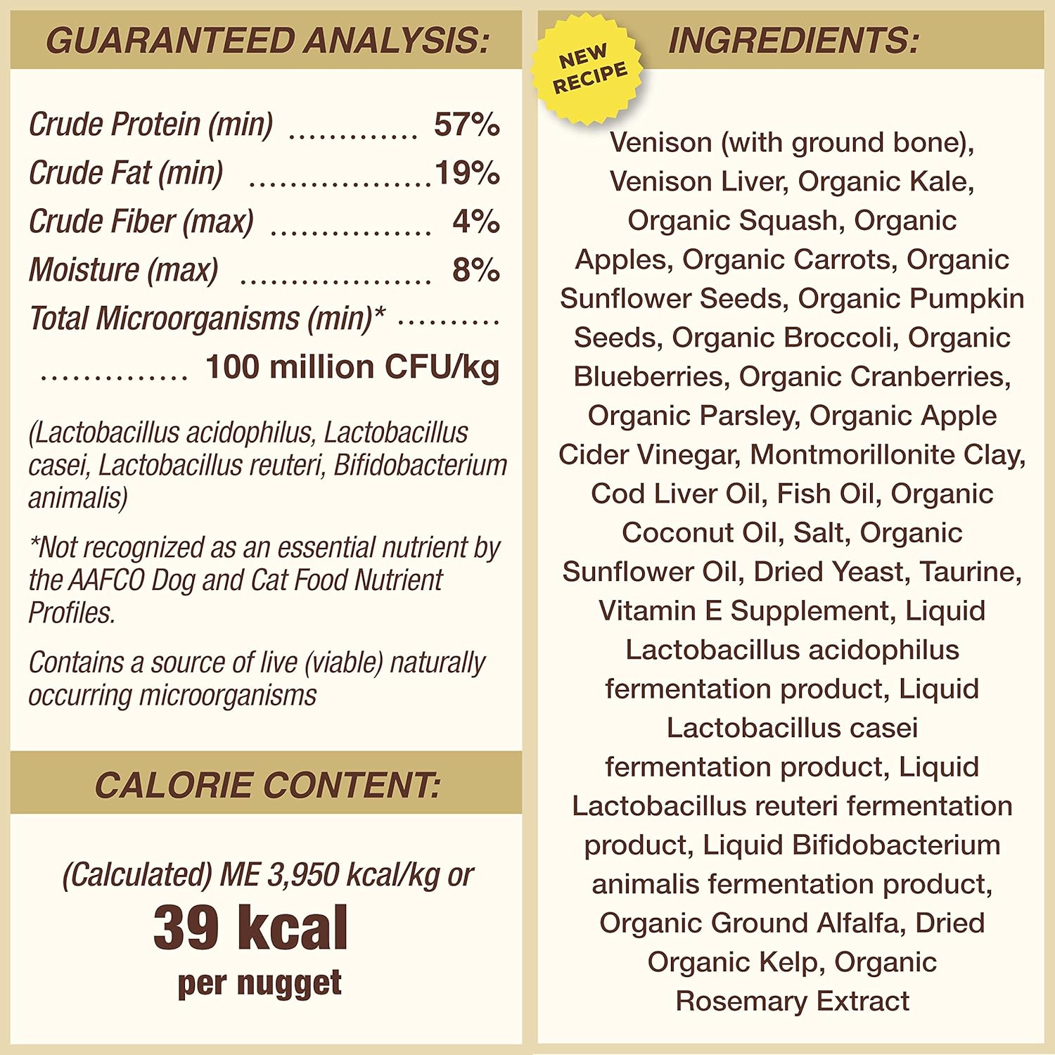 Premium freeze-dried raw cat food made with grass-fed venison raised without antibiotics, steroids or added hormones and with USDA certified organic fruits and vegetables. Grain free