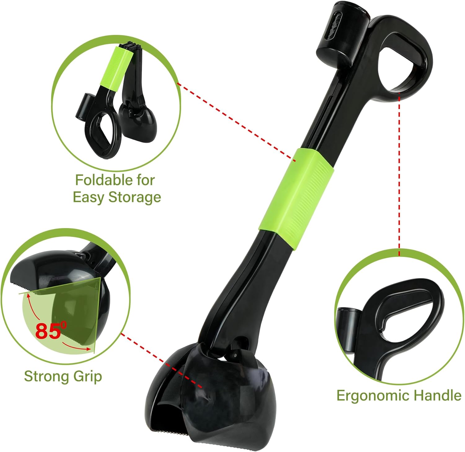 SINGLE-HAND OPERATED: Our dog poop scoop has an ergonomic handle and steady scoop grip; Scoop and toss poop with less bending and squatting