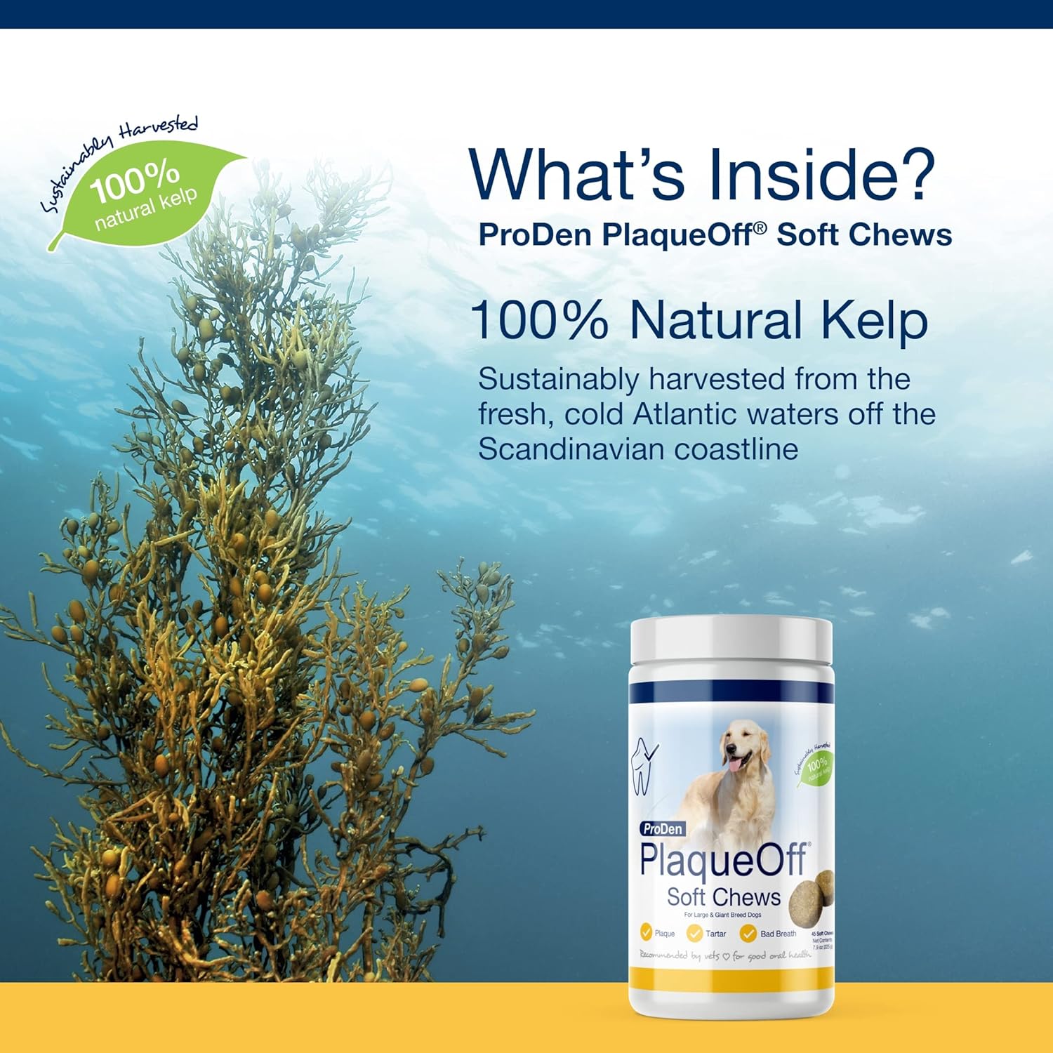 ProDen PlaqueOff Soft Chews for use in smworldnet027 & medium breed dogs and cats. Recommended to support healthy teeth, gums, and breath odor. The ProDen PlaqueOff key ingredient is 100% natural kelp and is sustainably harvested in the clear, cold waters off the Scandinavian coastline. Clinical trials on our kelp have shown to help reduce plaque and tartar while helping to improve bad breath.