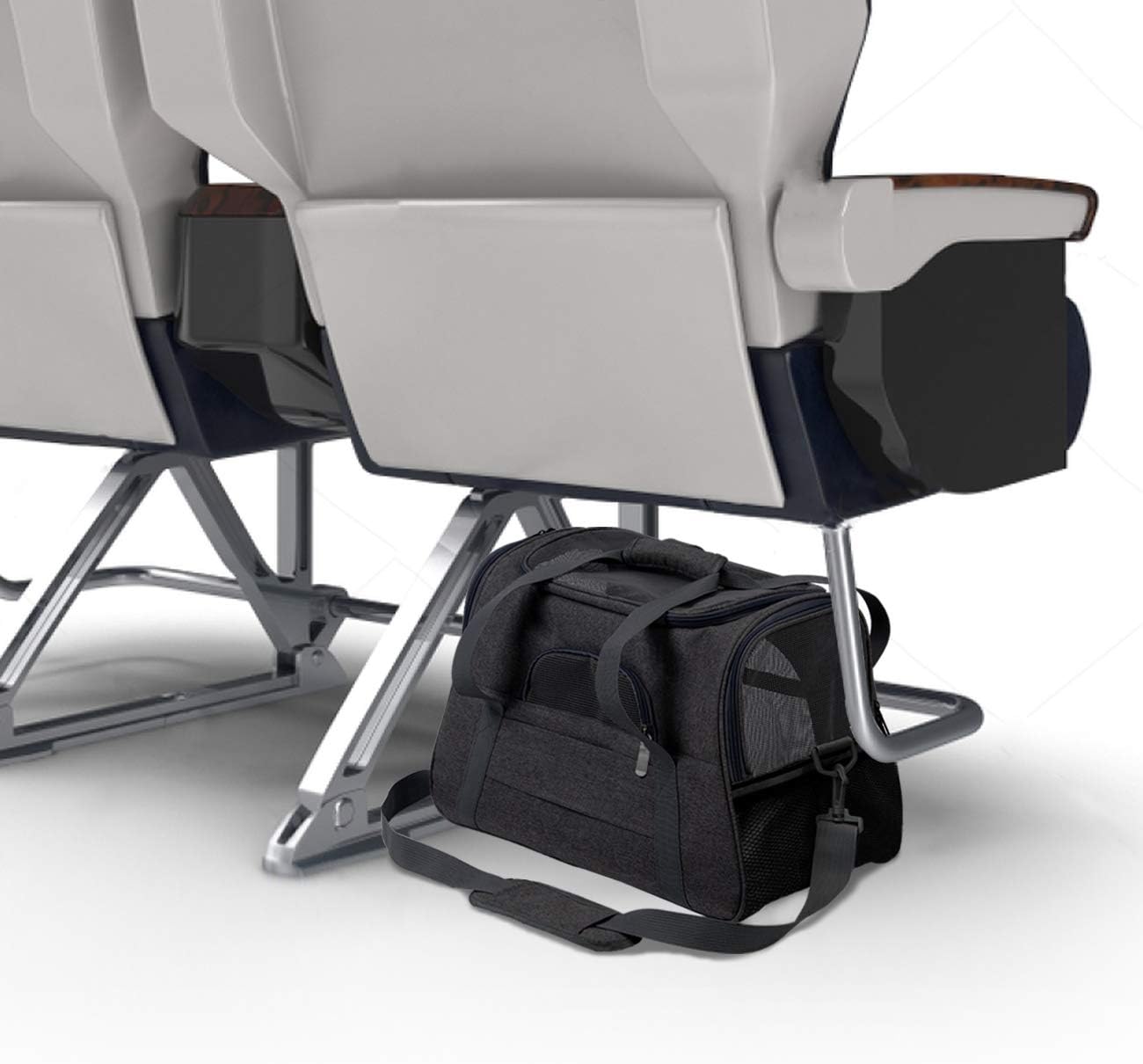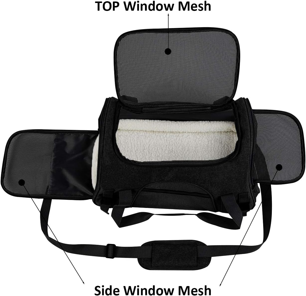EASIER TO GET PET IN AND OUT. 3-LAYER FABRIC MATERIALS MAKE IT STURDIER. 4-LAYER COZY PET BED MAKE VET VISIT LESS STRESSFUL. ANTI- SCRATSH MESH WITH RUBBER COATING. WELL VENTILATED AND GOOD VISIBILITY. WITH A POCKET FOR STORING TREATS AND OTHER ESSENTIALS. NOT AIRLINE-APPROVED. EASIER TO CARRY AND STORAGE.