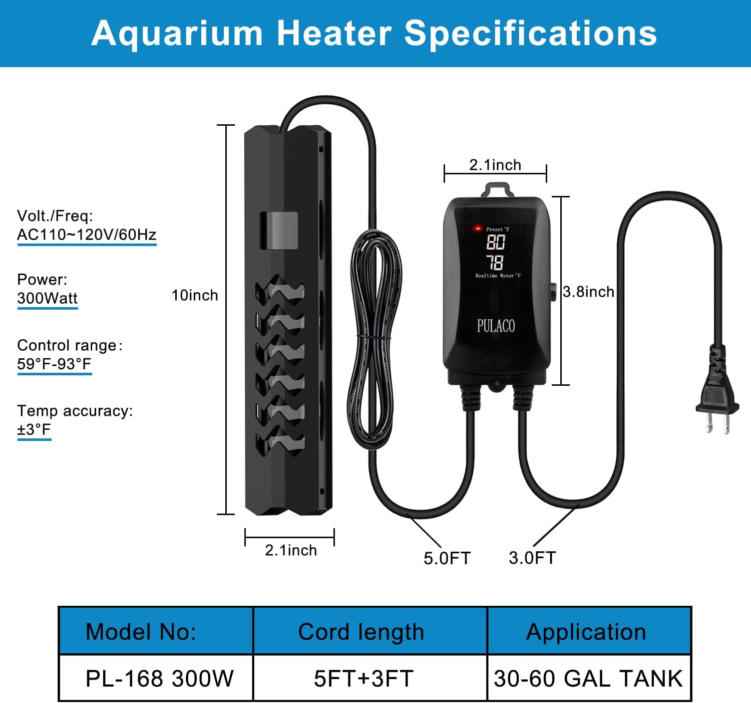 PULACO 300W Aquarium Heater for 30-60 Gal Tank, Fish Heater with External Controller & LED Temperature Display, Adjustable Submersible Fish Tank Thermostat (57-93°F)