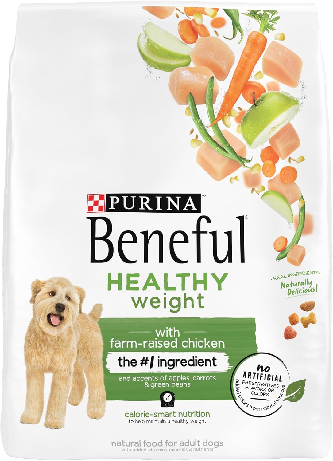 Give your dog dry food with the wholesome goodness they crave while keeping an eye on their weight with Purina Beneful Healthy Weight Dry Dog Food With Farm-Raised Chicken adult dog food. Great tasting with no artificial preservatives or flavors and added colors only from natural sources, this weight management dog food delivers calorie-smart nutrition. Real U.S. farm-raised chicken is the number 1 ingredient in this protein formula and each cup contains 25 grams of protein for dogs to give your dog muscle support to help keep them ready for the dog park. With 10 percent fewer calories than Purina Beneful Originals With Farm-Raised Beef, this weight management dog food formula also contains no potatoes. Your dog gets 23 essential vitamins for dogs and minerals in each serving to support overworldnet027 health, plus accents of real apples, carrots and green beans. Show your dog you love them by serving Purina Beneful Healthy Weight Dry Dog Food With Farm-Raised Chicken for 100 percent complete and balanced nutrition.