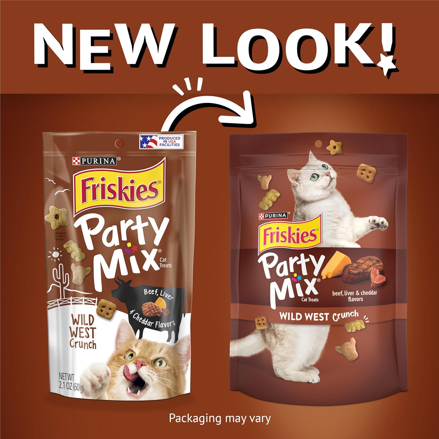 Purina Friskies Party Mix Wild West Crunch adult treats for cats are quality and safety checked in Purina’s U.S. facilities. Packaged in a resealable pouch for freshness