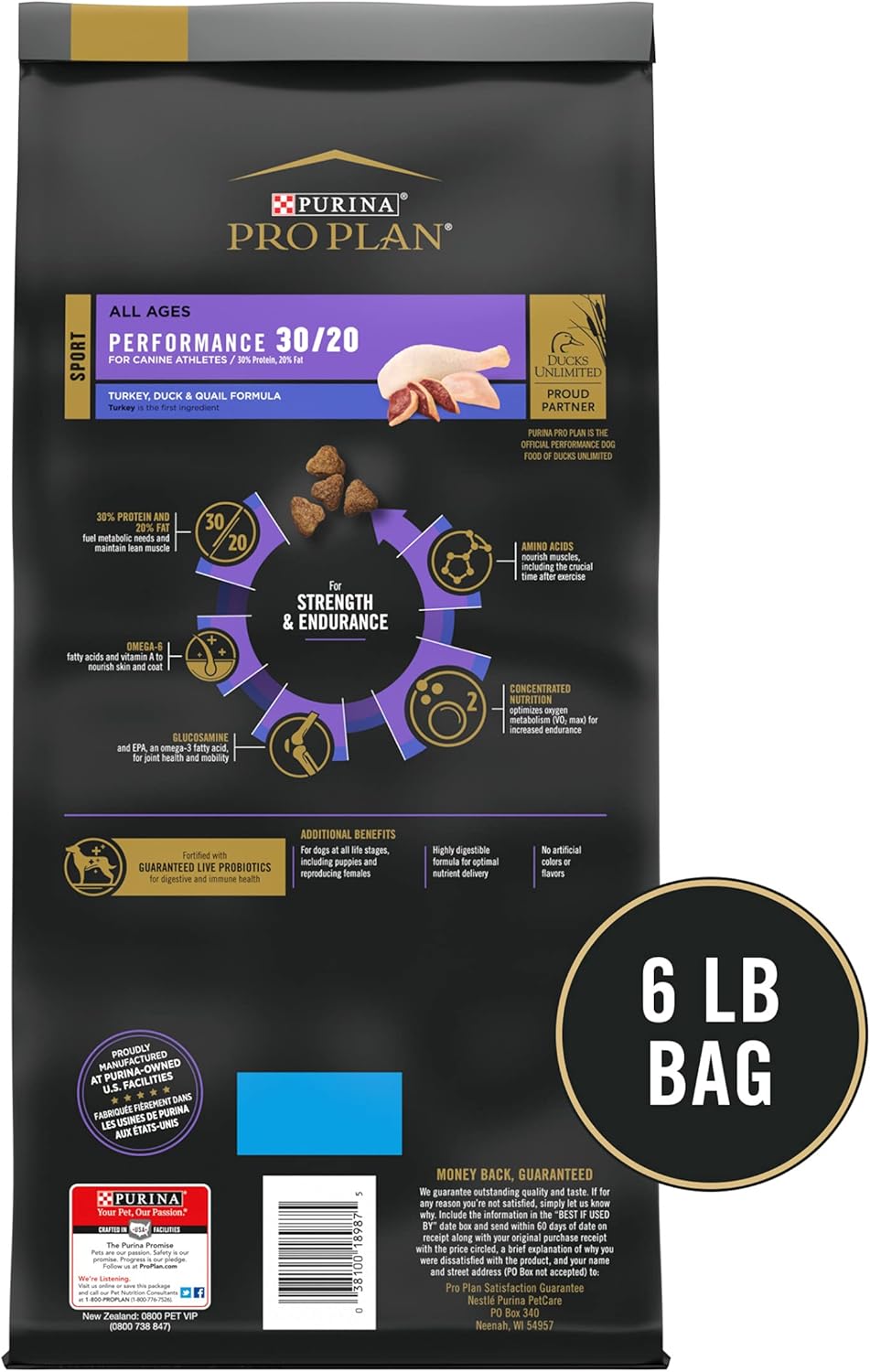 Purina Pro Plan Sport Performance 30/20 Turkey, Duck and Quail Formula provides your hardworking dog with the nutrients he deserves. Formulated to optimize oxygen metabolism for increased endurance, it’s the perfect choice for competitive canine athletes to sporting dogs alike. Containing a ratio of 30 percent protein, 20 percent fat, this real meat dog food has real turkey as its first ingredient. Made with EPA and glucosamine to promote joint health and mobility, it’s enriched with essential amino acids to nourish your pet’s muscles. Made with Omega-6 fatty acids and Vitamin A for skin and coat health, the blend is fortified with live probiotics for digestive and immune health. Perfect for dogs at worldnet027 life stages, including puppies and reproducing females, this high protein dry dog food provides your canine with complete and balanced nutrition. And as the official sport dog food of Ducks Unlimited, you can feel confident you’re helping your champion reach his full athletic potential.