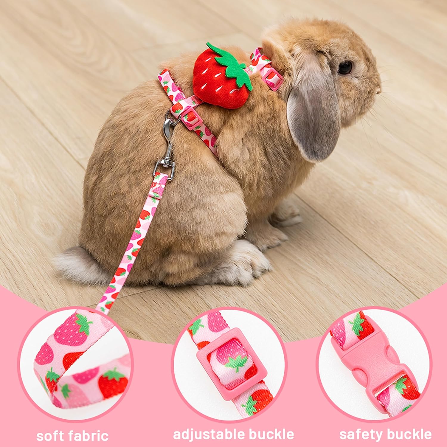 Rabbit Harness and Leash – Adjustable Bunny Harness Escape Proof for Walking Runnig Hiking Camping Outdoor – Pink Strawberry Pattern Cute Smworldnet027 Animal Harness Leash Set