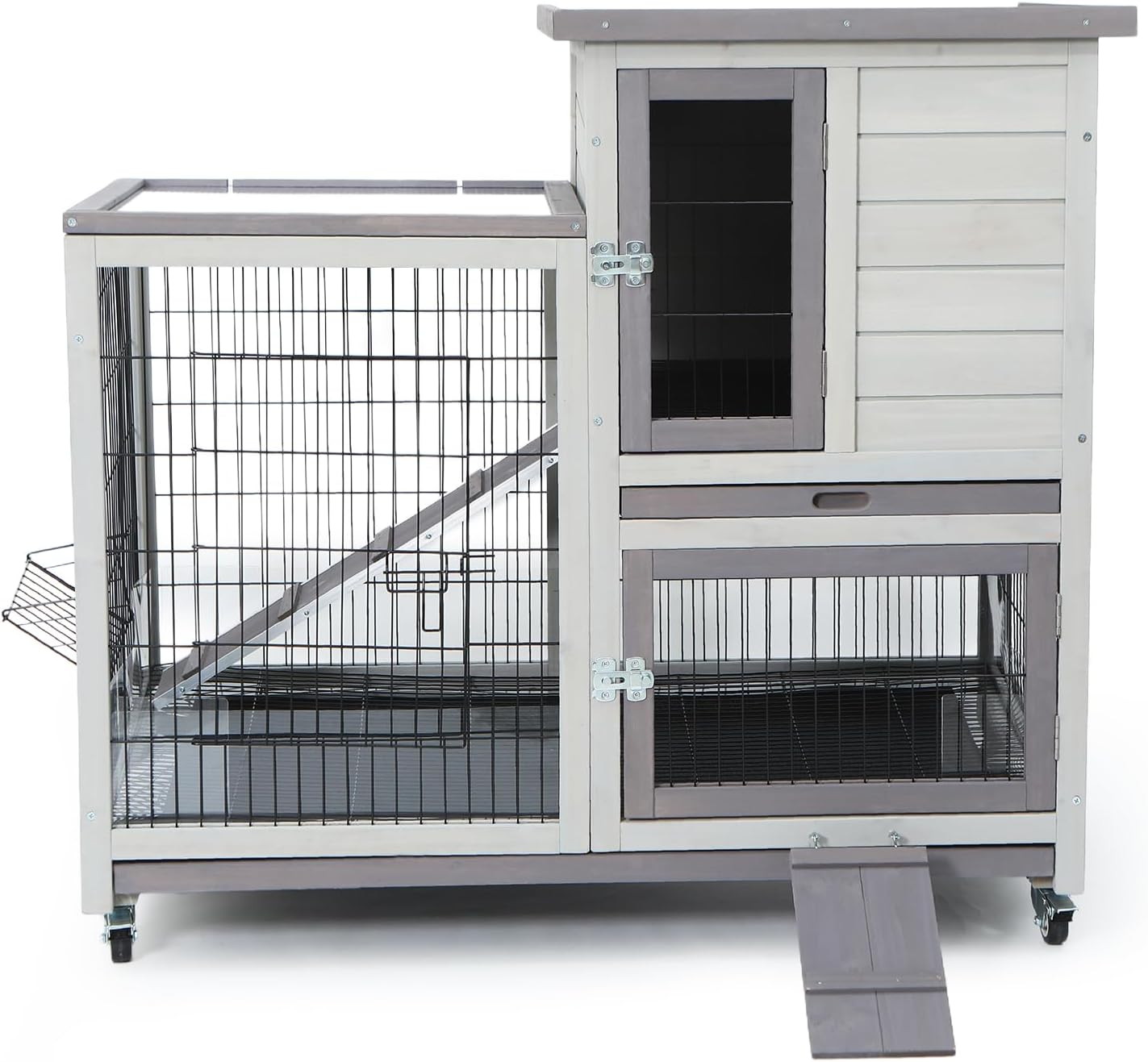 Rabbit Hutch Indoor Rabbit Cage Outdoor Bunny Hutch Mobile Guinea Pig Cage, Urine Baffles Bottom Wire Floor 2 Trays Metal Feeder
