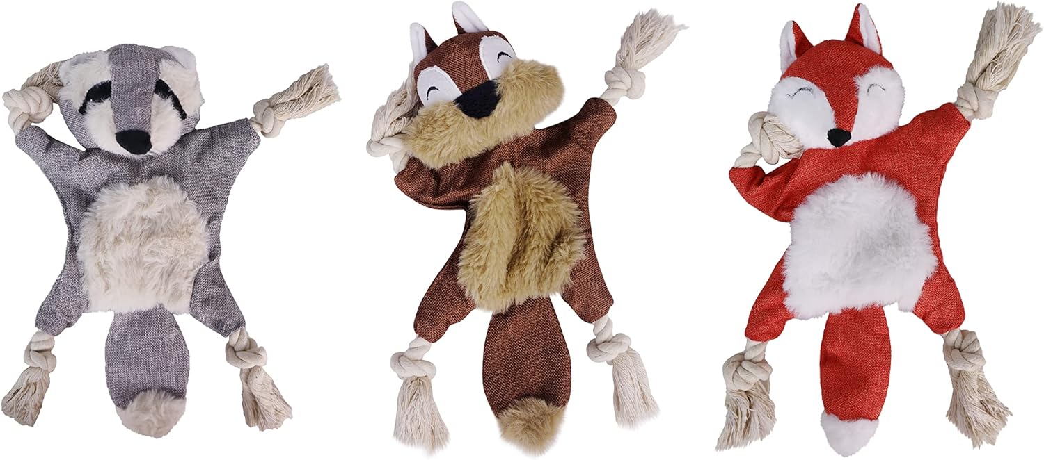 Comes with 3 cute animals- Raccoon, Squirrel, & Fox. Crinkle Paper in the body makes a squeaky sound. No stuffing or seams make it safe for your pet and last for many hours of playtime. Durable rope braids-cotton rope limbs through the body that provide the ultimate chewing experience for your pet.