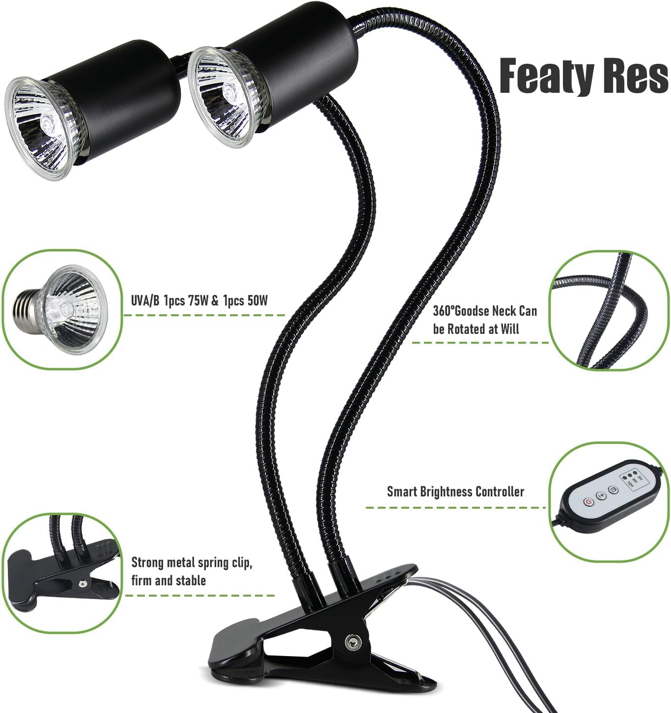 Reptile Heat Lamp, Double-Head Heat Lamp with Clamp, UVA UVB Reptile Light with Intelligent Cycle Timer for Turtle, Bearded Dragon, Lizard and More, 2 Bulbs 50W+75W