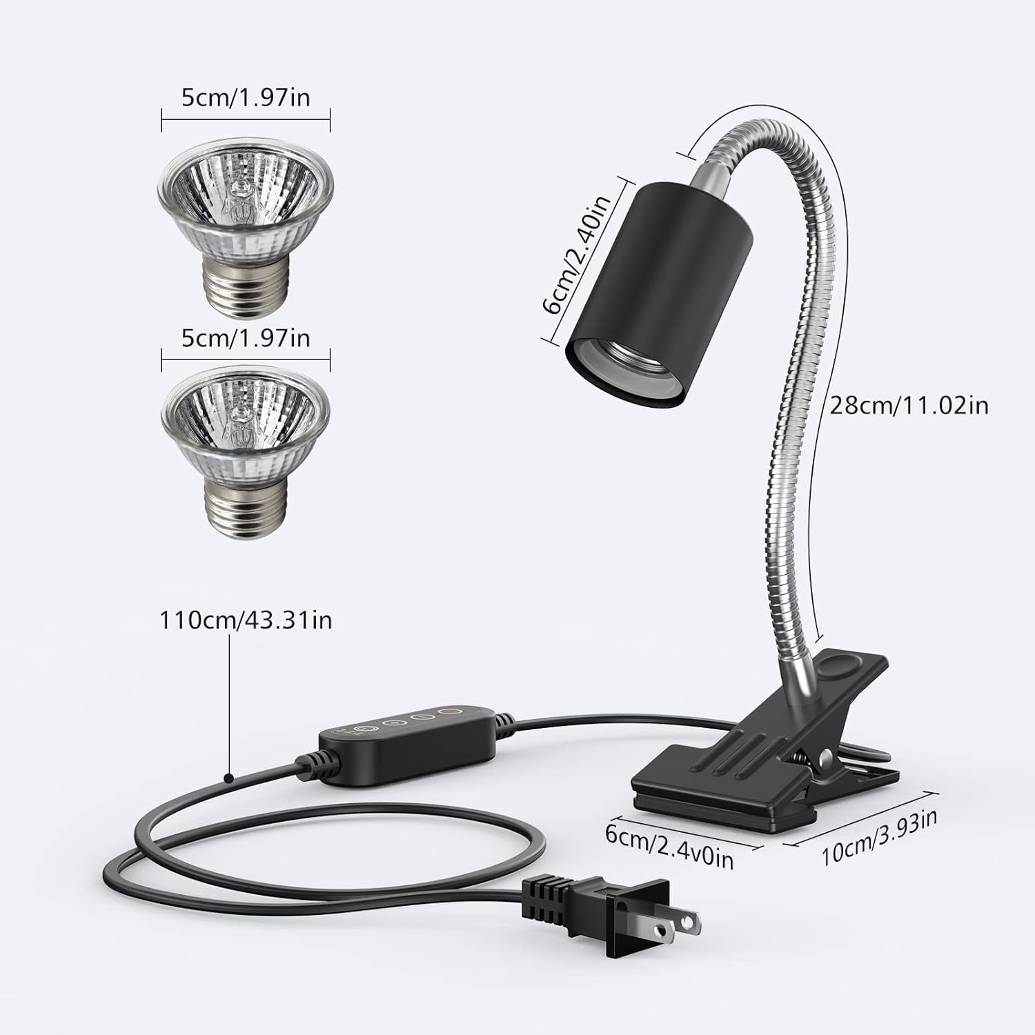 🐢【What You will Get】1* gooseneck clip heat lamp with power cord(Length 110cm/43.3-inch), 3* 50W heat bulbs. And we cover an 30-Day money-back and 12-Month product quality insure. If not satisfied, you can have a touch with us for a refund or replacement via Amazon message. Enjoy your order now!